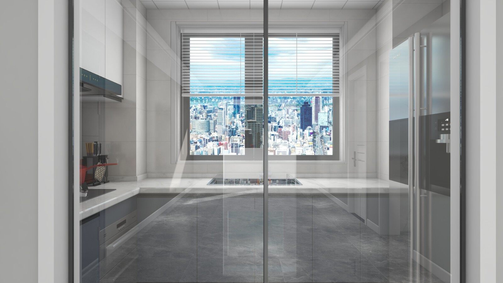 厨房与客厅之间使用玻璃移门代替,增加客厅的采光实力。厨房采用L型操作台,并且冰箱放在厨房里,将空间最大化利用!