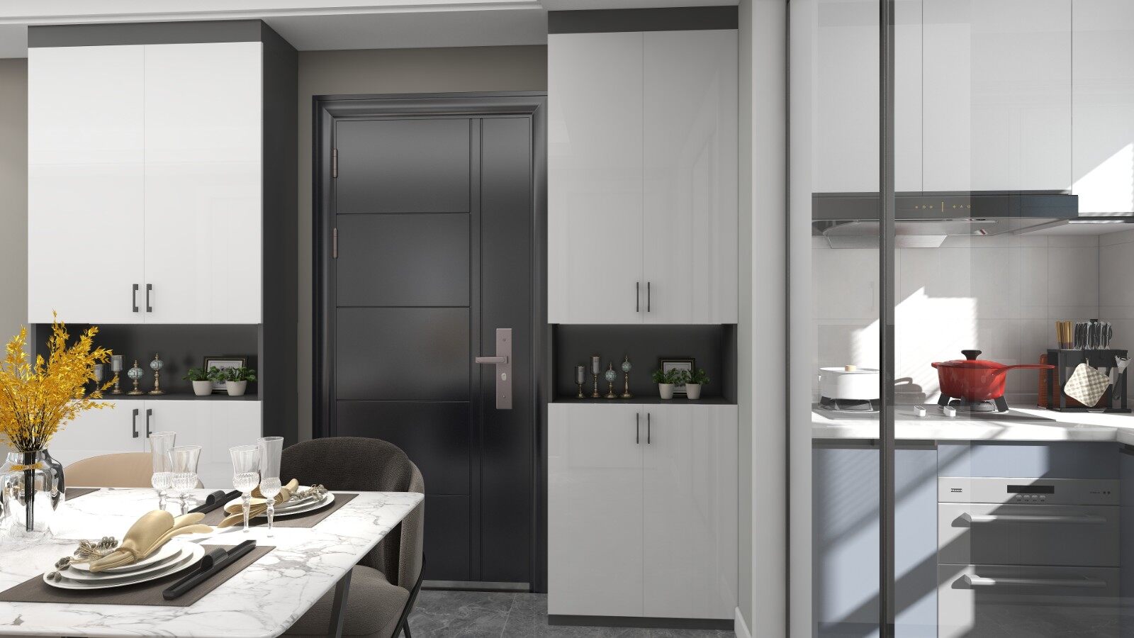 进门玄关处设置两个储物柜,满足业主一家大量的收纳需求,中间镂空部分可以随手放置进出门物品。