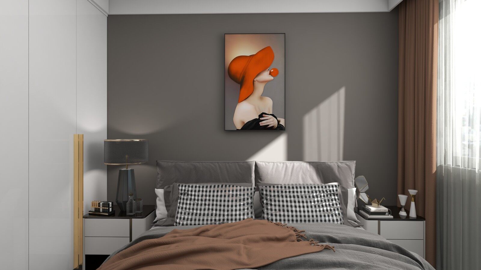 卧室背景墙不做多余的色彩与装饰,再以挂画点缀出简约而不俗的氛围,设置大容量衣柜,休息储物两不误。