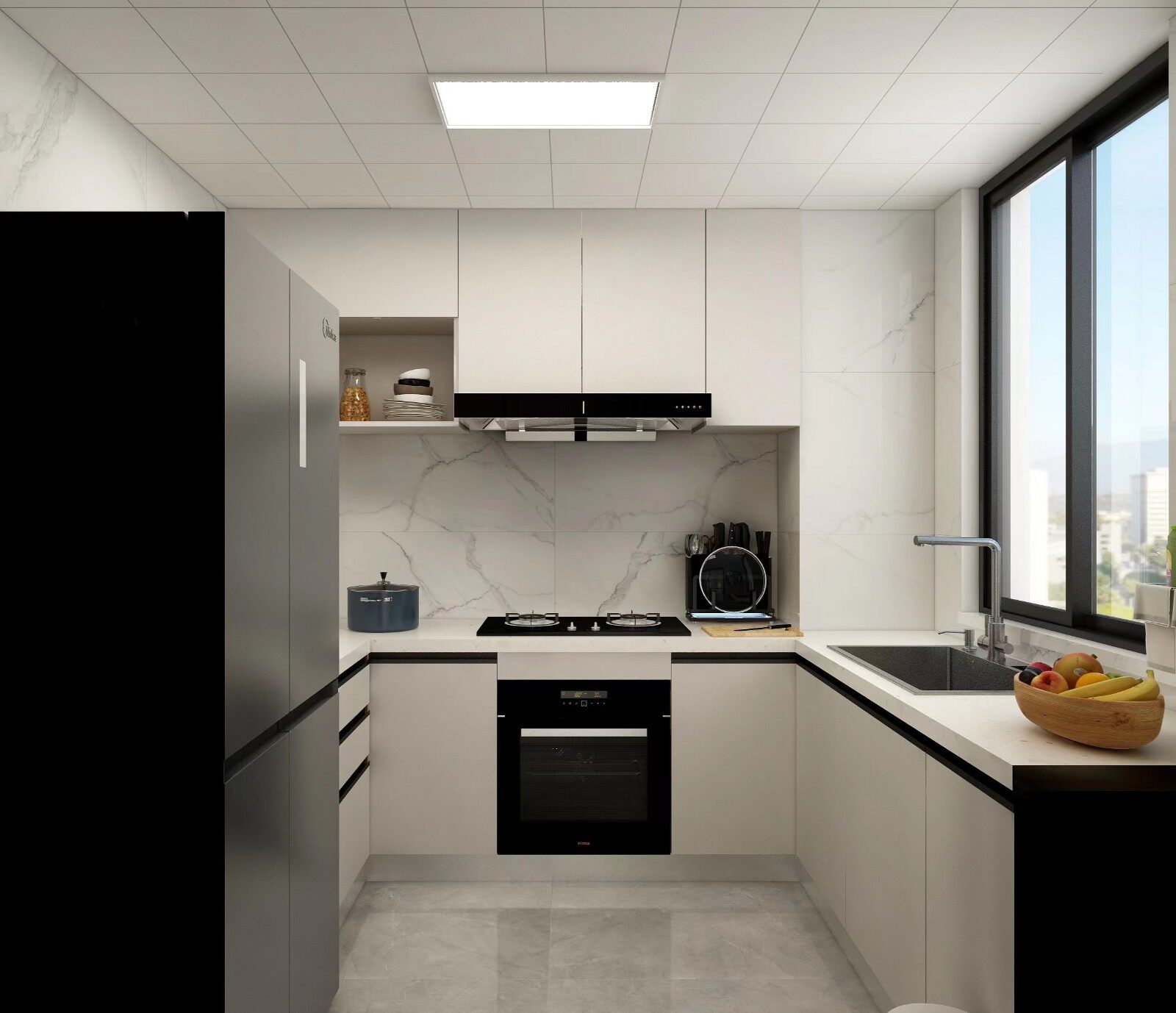 厨房采用大理石墙砖,便于清洁,整体黑白线条勾勒出大气的空间氛围,同时将冰箱放置在厨房内,拿取食材方便快捷。
