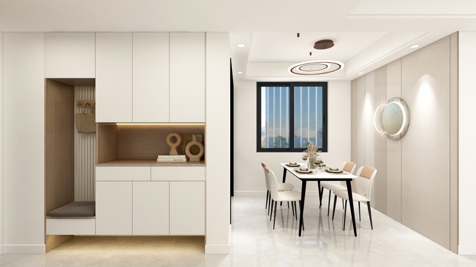 入户玄关处设置鞋柜,中间镂空部分可以随手放置物品,底部留空便于放置经常穿放的鞋子。