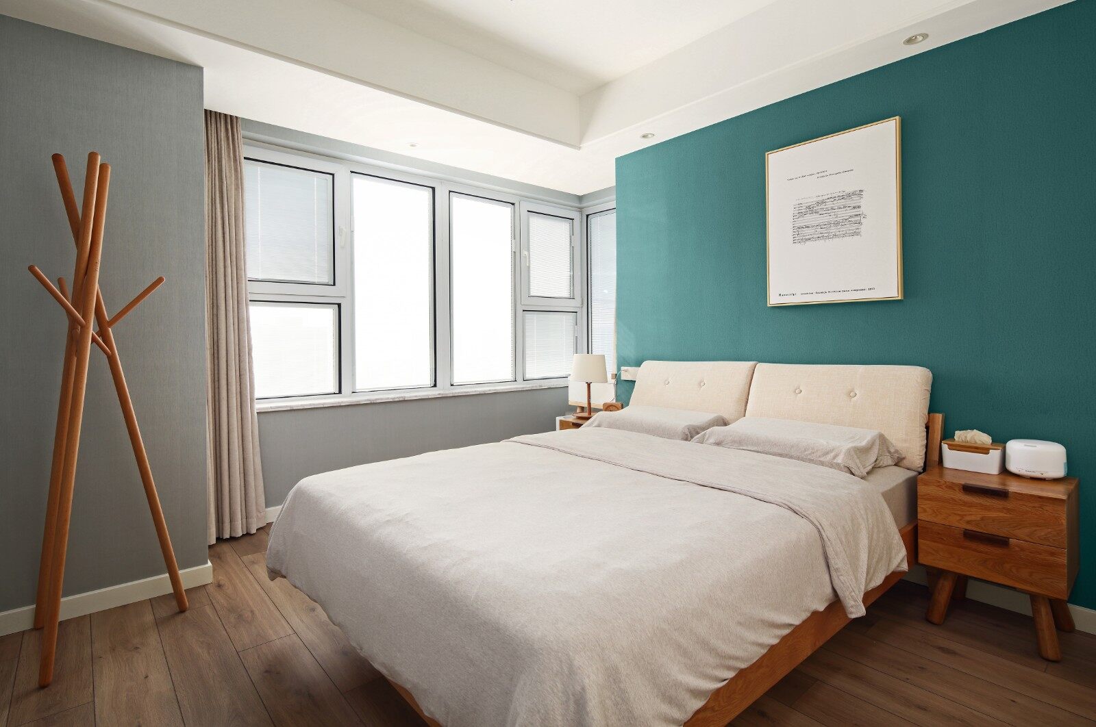 房间内采用少量深棕家具与墨蓝背景墙搭配,平添了空间的复古韵味。地板也选用实木地板,很有质感。