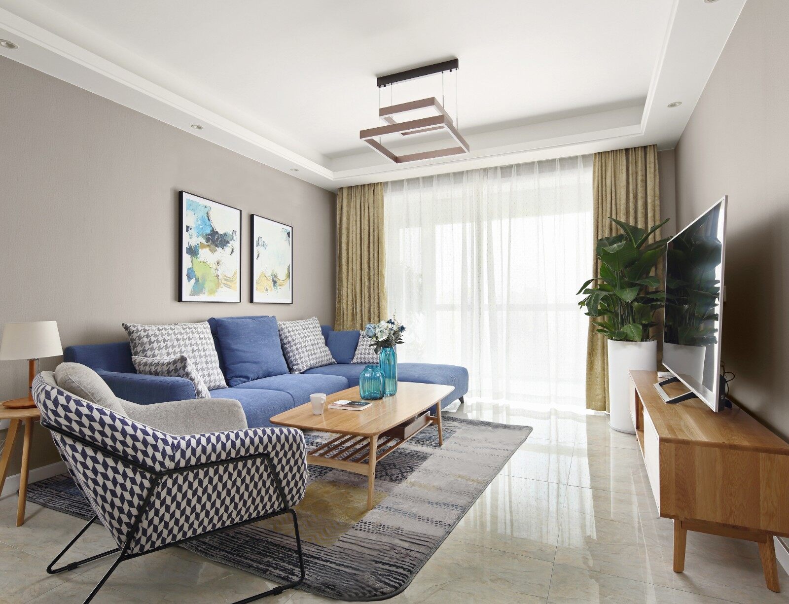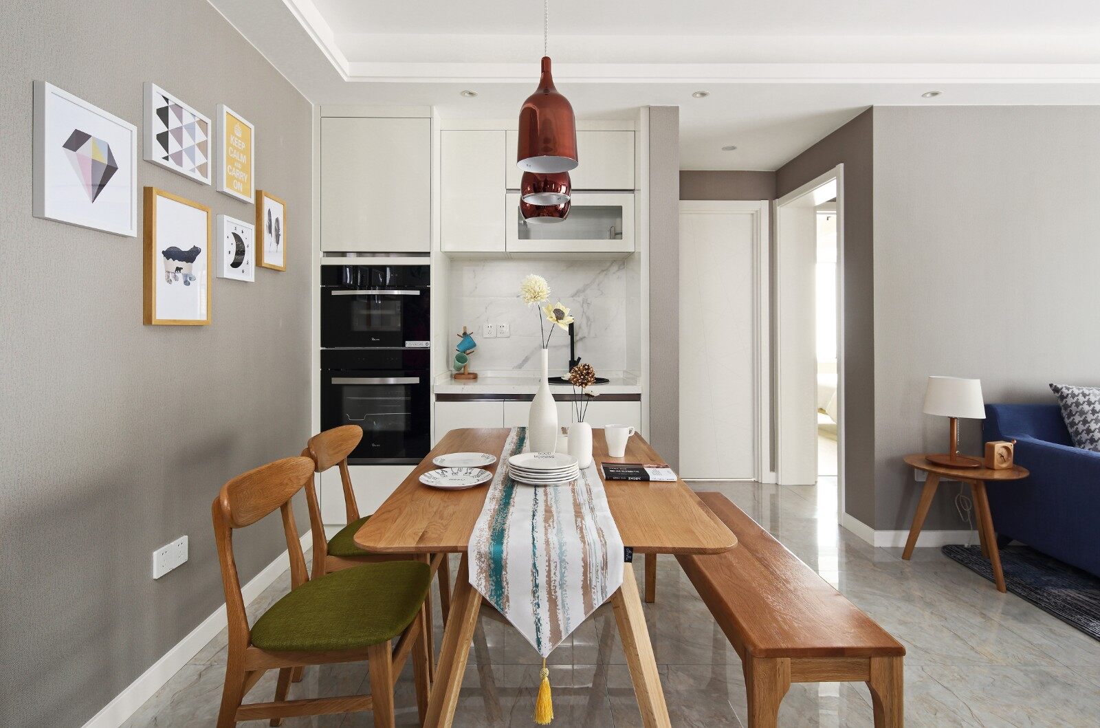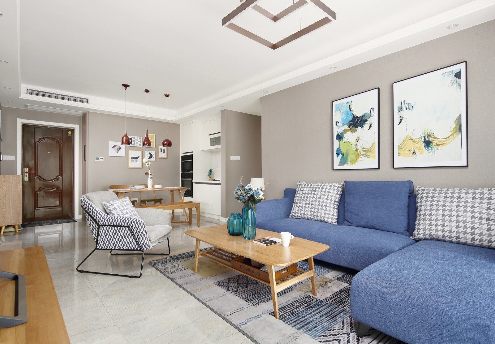 客餐厅一体设计,更显空间开阔明朗!在选材以及颜色搭配上,以经典灰色和温和木色为主,搭配低饱和度的蓝色,提升空间活跃氛围。