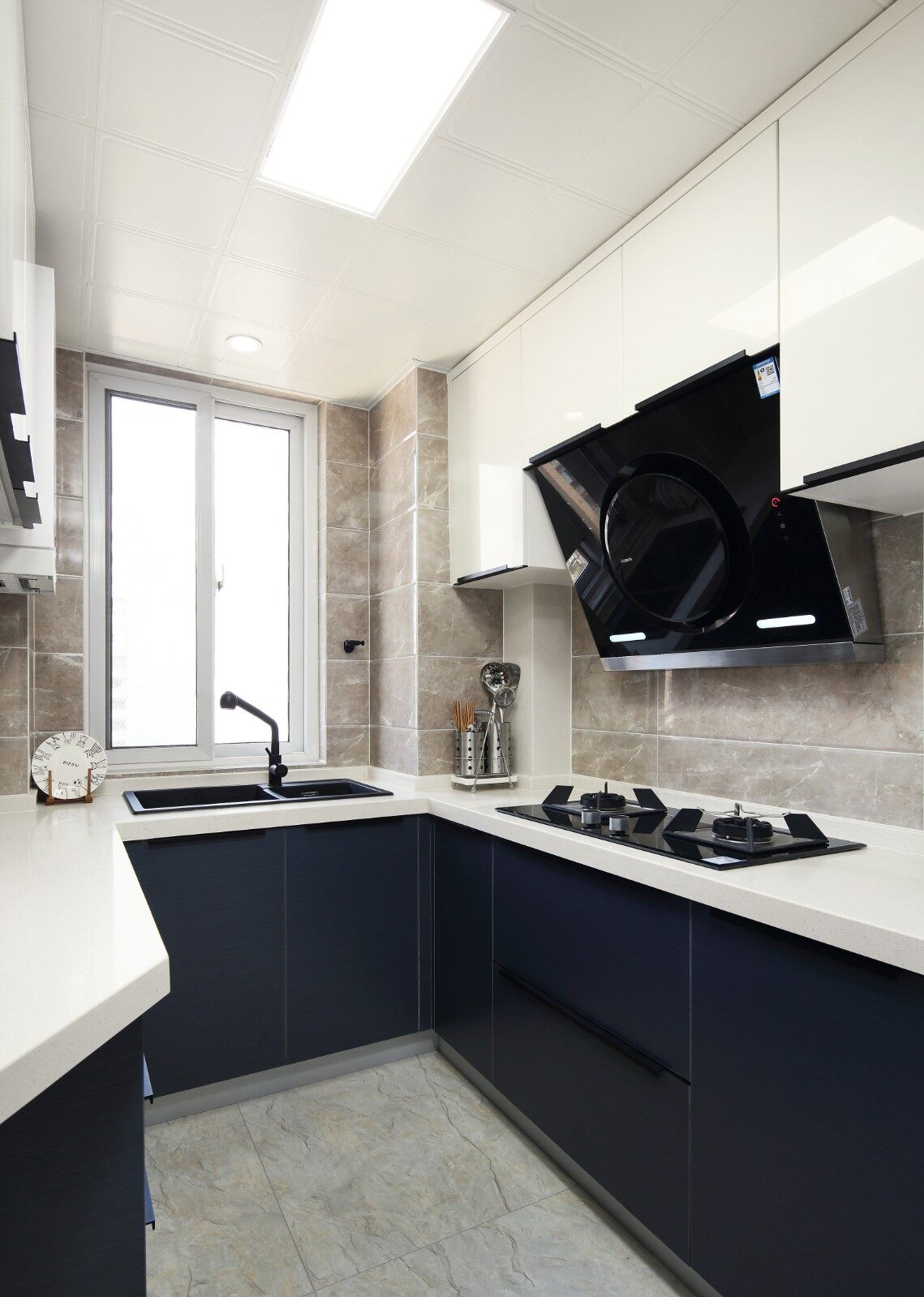 厨房选用U型操作台,洗切炒一气呵成,下厨更有效率。黑白搭配,让人感受经典色系的魅力所在。