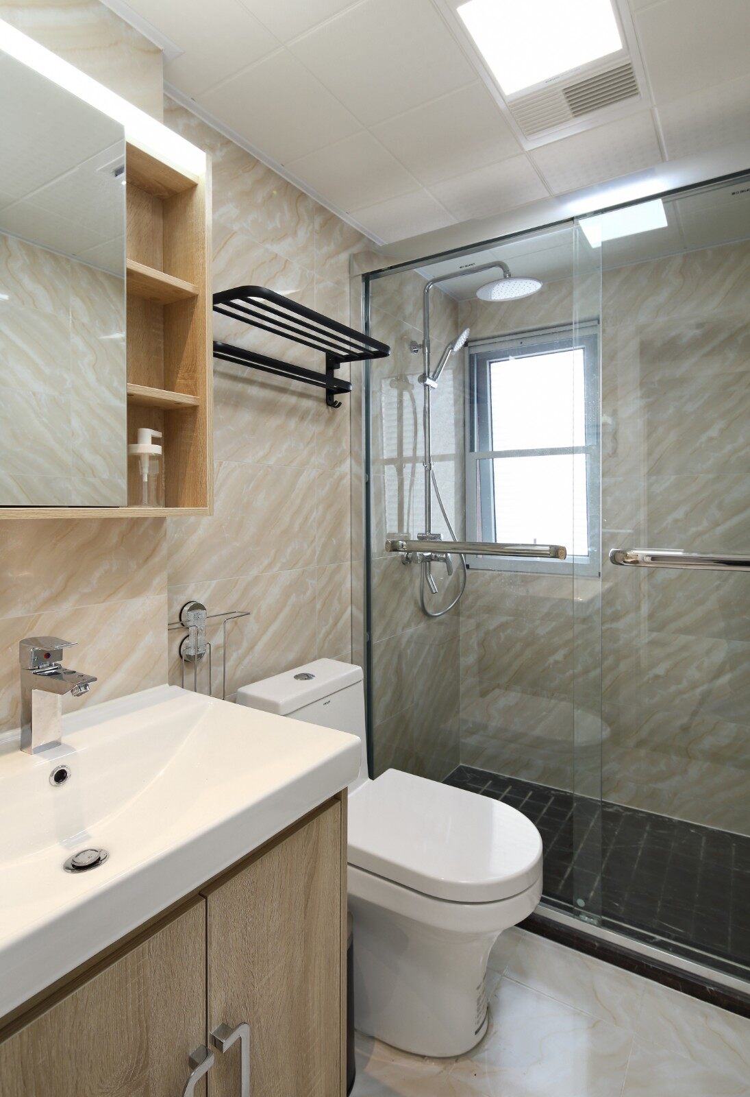 卫生间干湿分离,更加人性友好。湿区采用黑色地砖,干区采用原木色,让整体空间视觉明朗开阔。