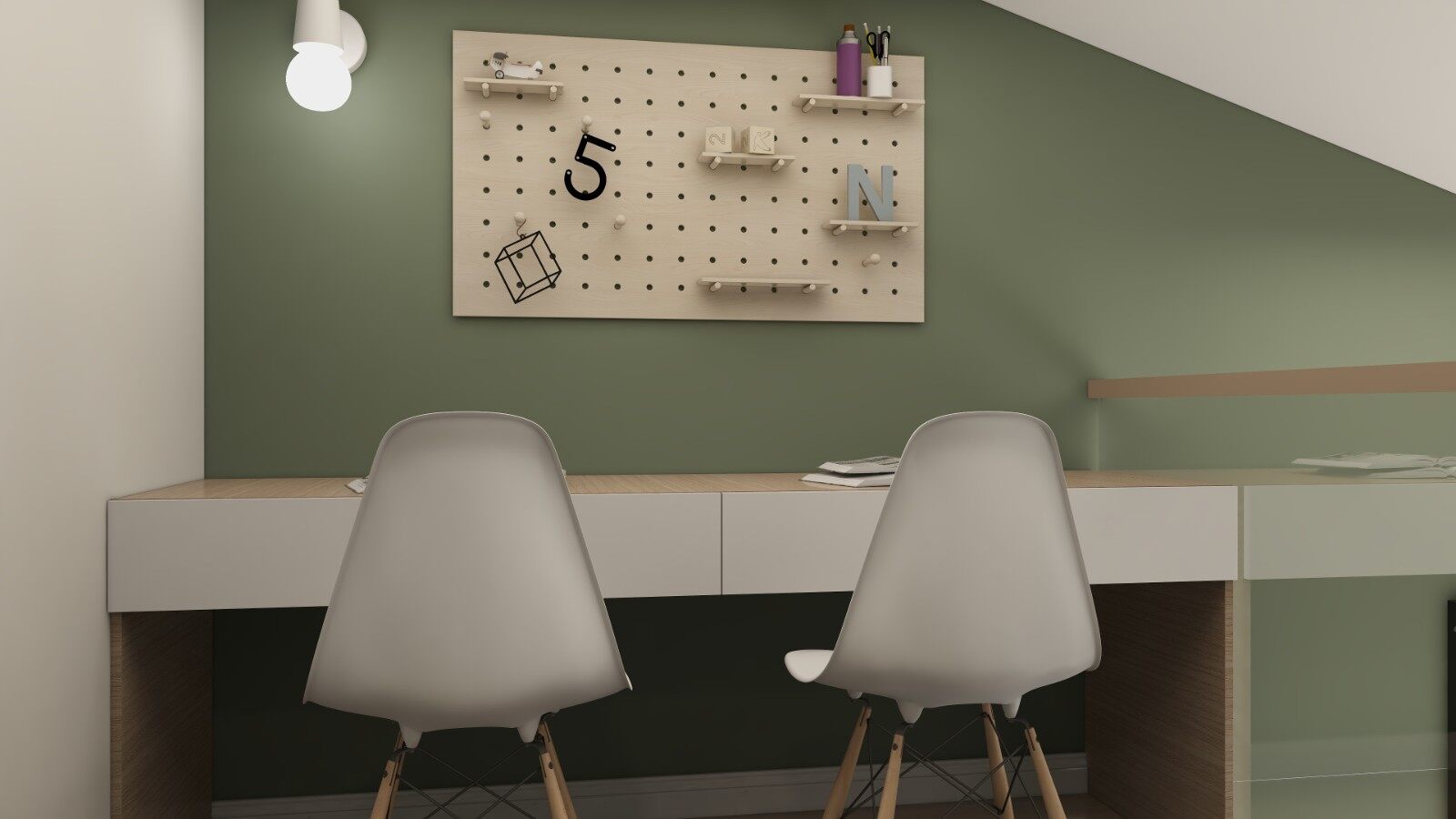书房以薄荷绿色调为背景墙,制造了让人眼前一亮的感觉,提高了视觉美观性,学习办公也更加宁静。
