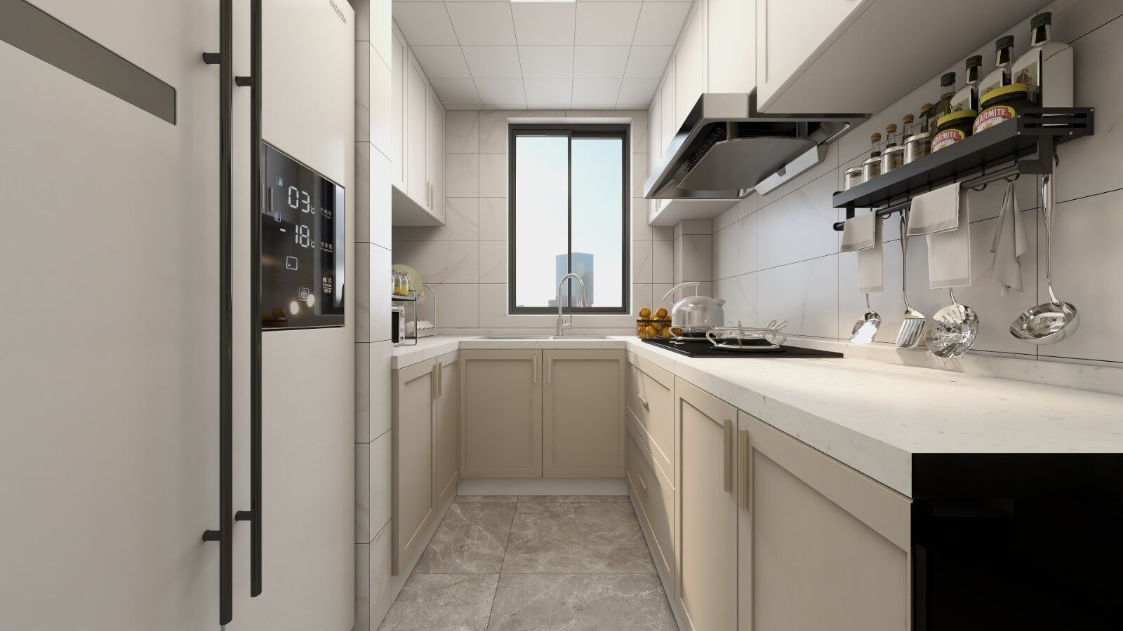 厨房整个空间在奶茶色系为主色的调配下,显得简约又大气。U型操作台方便合理,下厨更顺手。