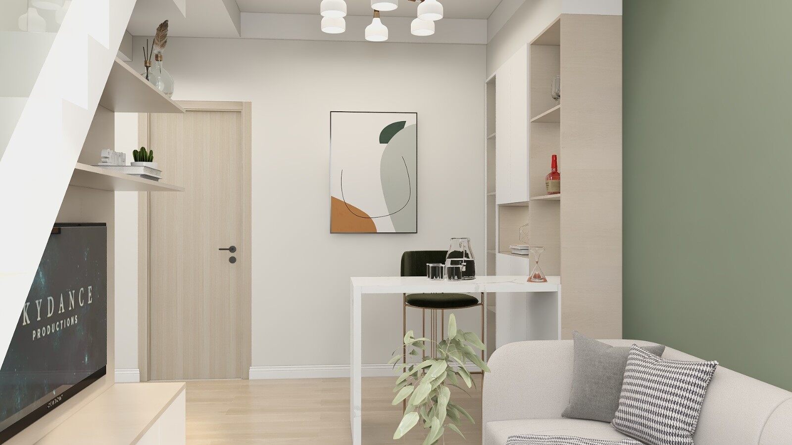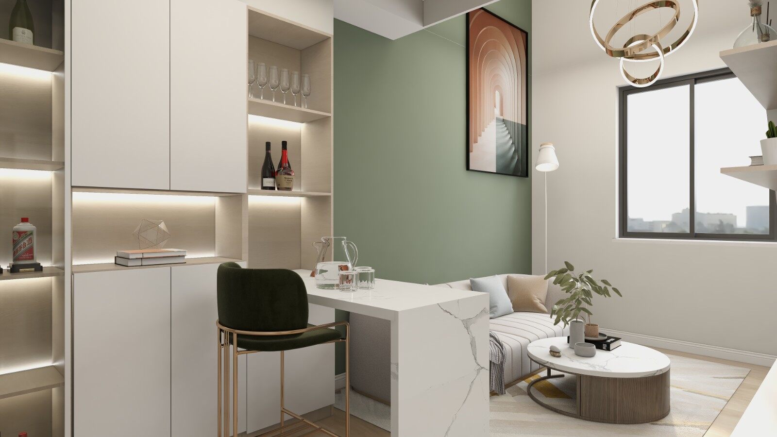 客餐厅一体化设计,合理利用空间!空间上统一的白色与薄荷绿搭配,通过窗户处的光线,让整个空间显得格外的舒适与慵懒