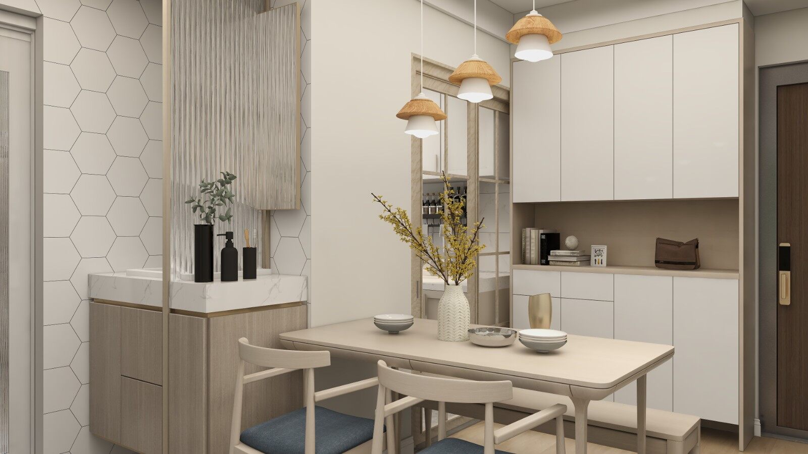 餐厅是客厅的延续,米白色和浅棕色的搭配相得益彰,杂乱无序的空间动过点、线、面的构造,显得平整有序。
