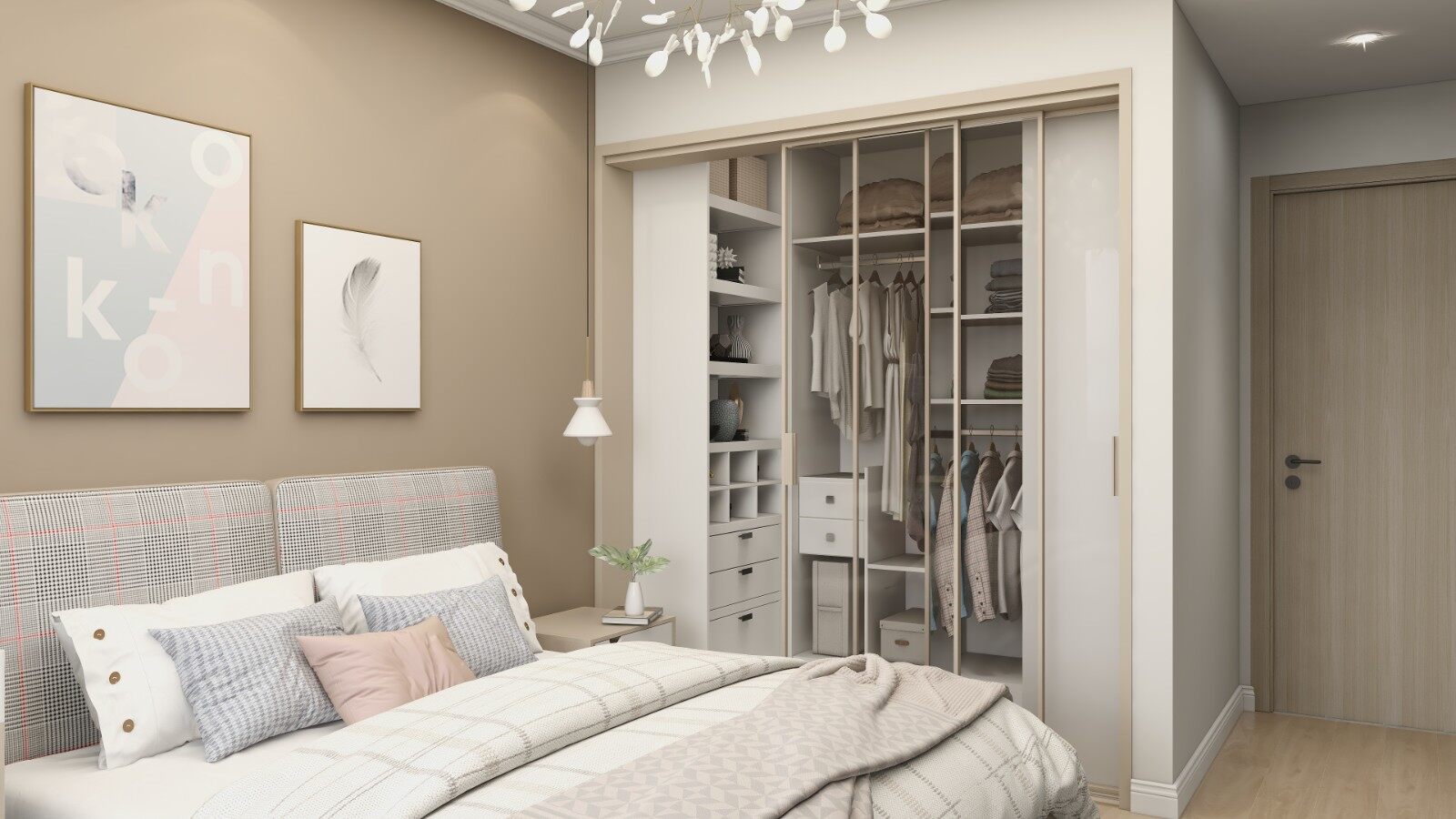 主卧的主题色调仍然是木饰面与米白色调的融合,设计师的用灯光的设计,为夜晚氛围的营造,衬托出温馨的色彩。