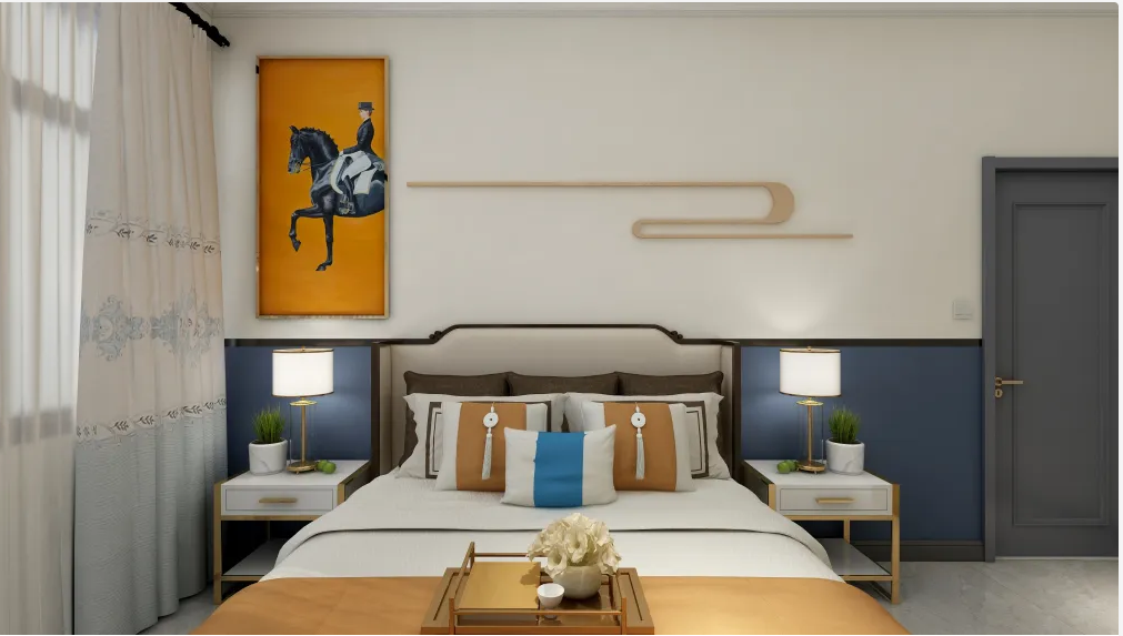 主卧以大胆的橙蓝撞色为主,呈现轻奢的气质。简约的家居陈设出利落与细腻,因忙碌而晃脑的日子,拥抱空间,思量简单的生活。