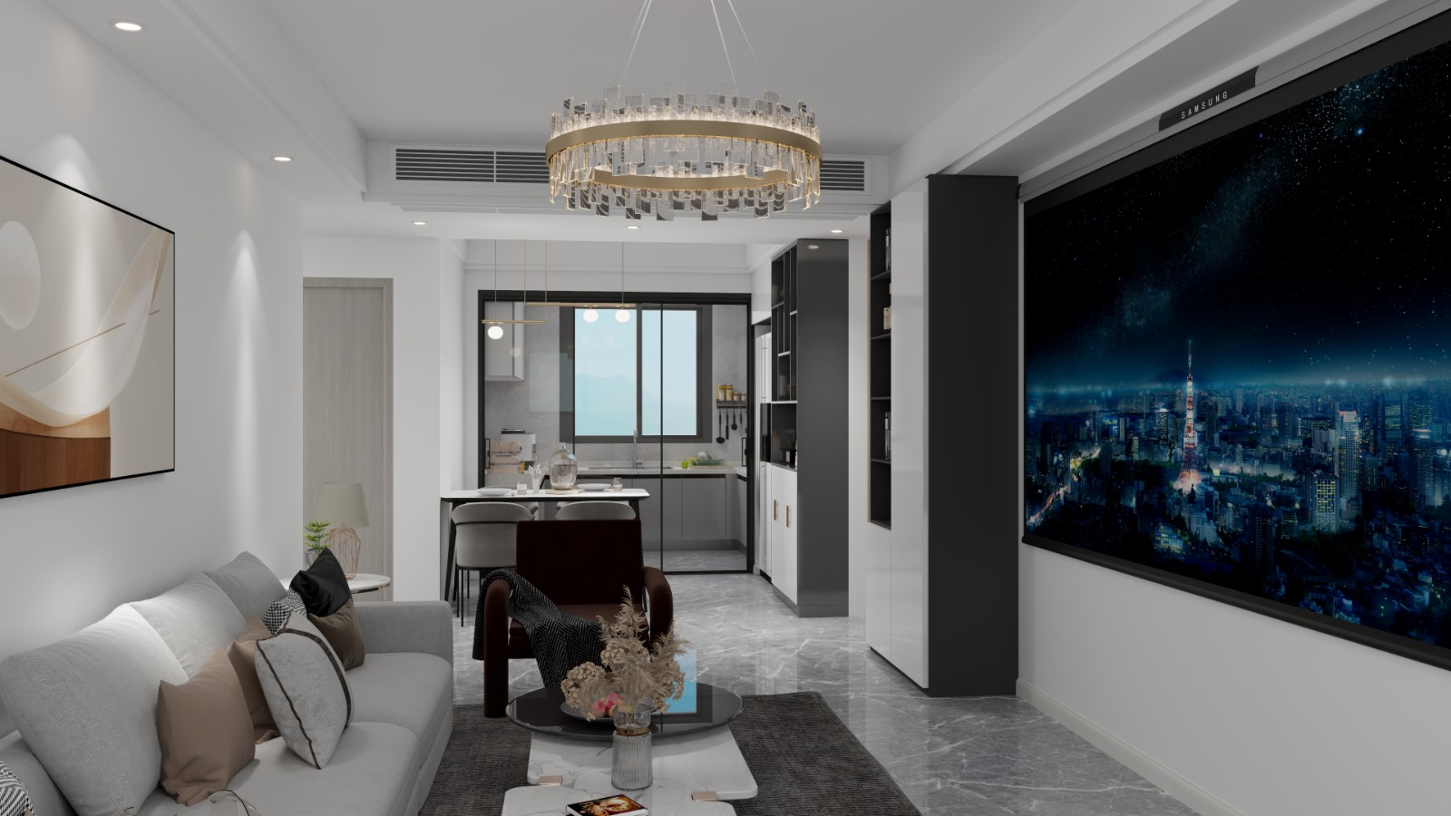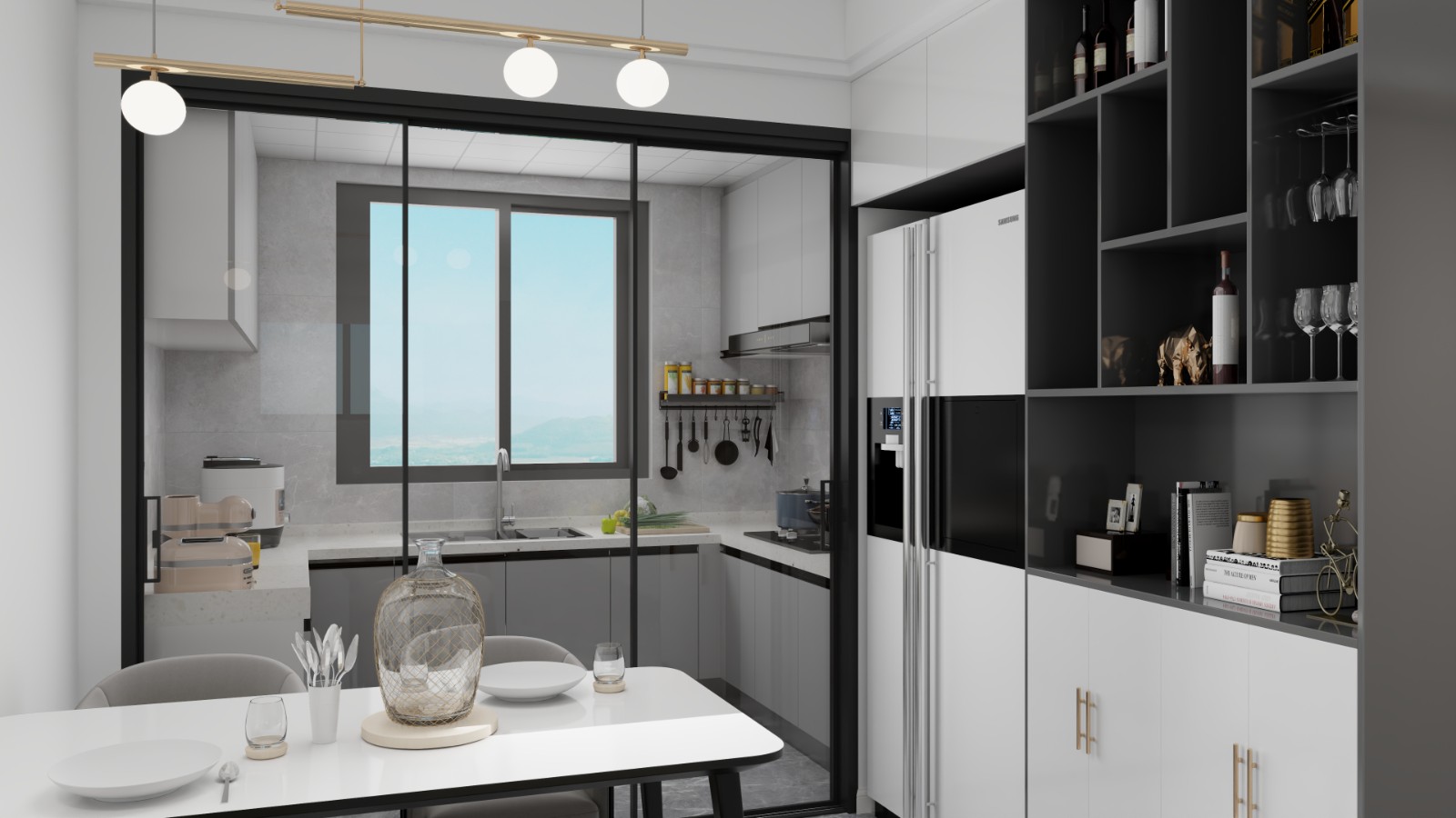 餐厅与厨房用窄边玻璃移门,防油烟,餐桌放在厨房外,动线更合理。