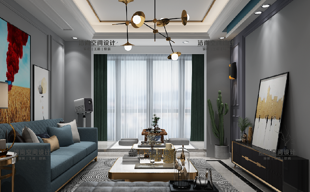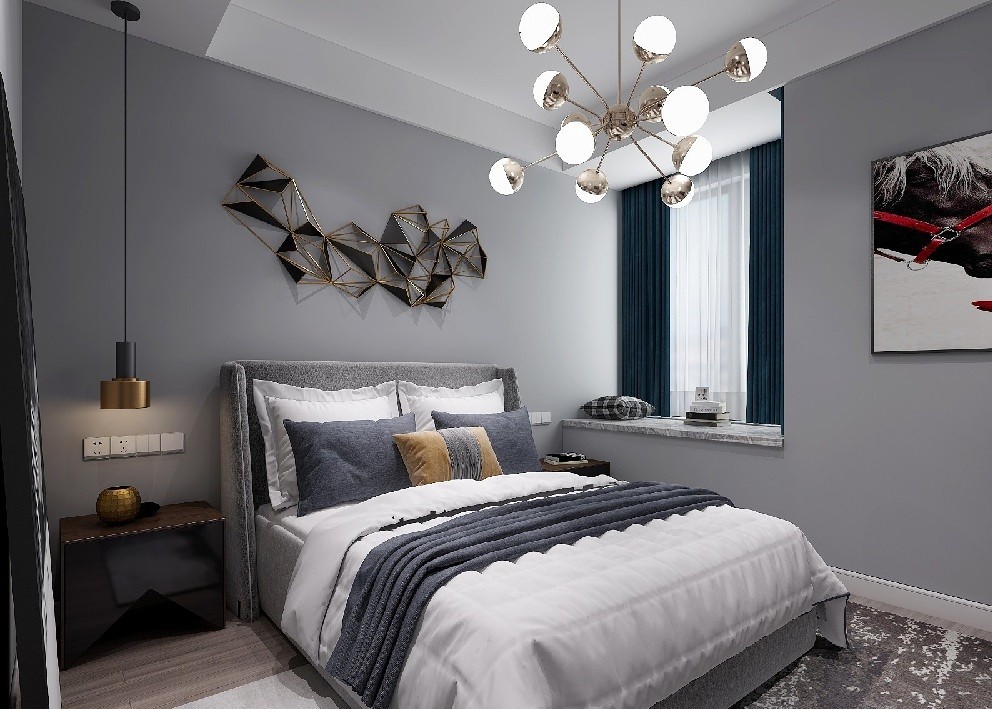 石膏线条的勾勒让整个空间更加的立体,灰色的木饰面造型背景配上装饰灯具,让空间产生一种独特的静谧。