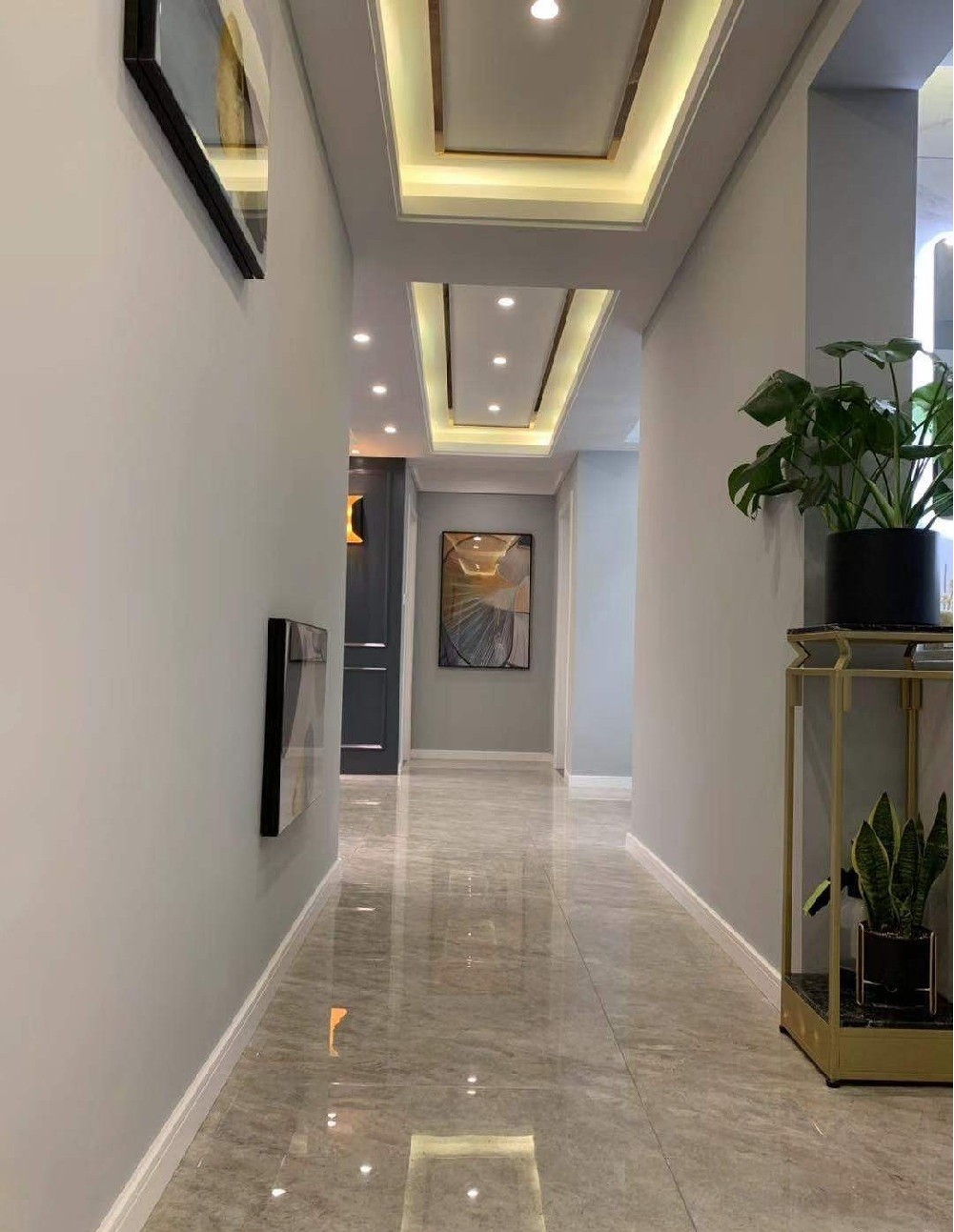 过道的顶面造型,配上背景画,玫瑰金的线条,配上灰色的地砖。