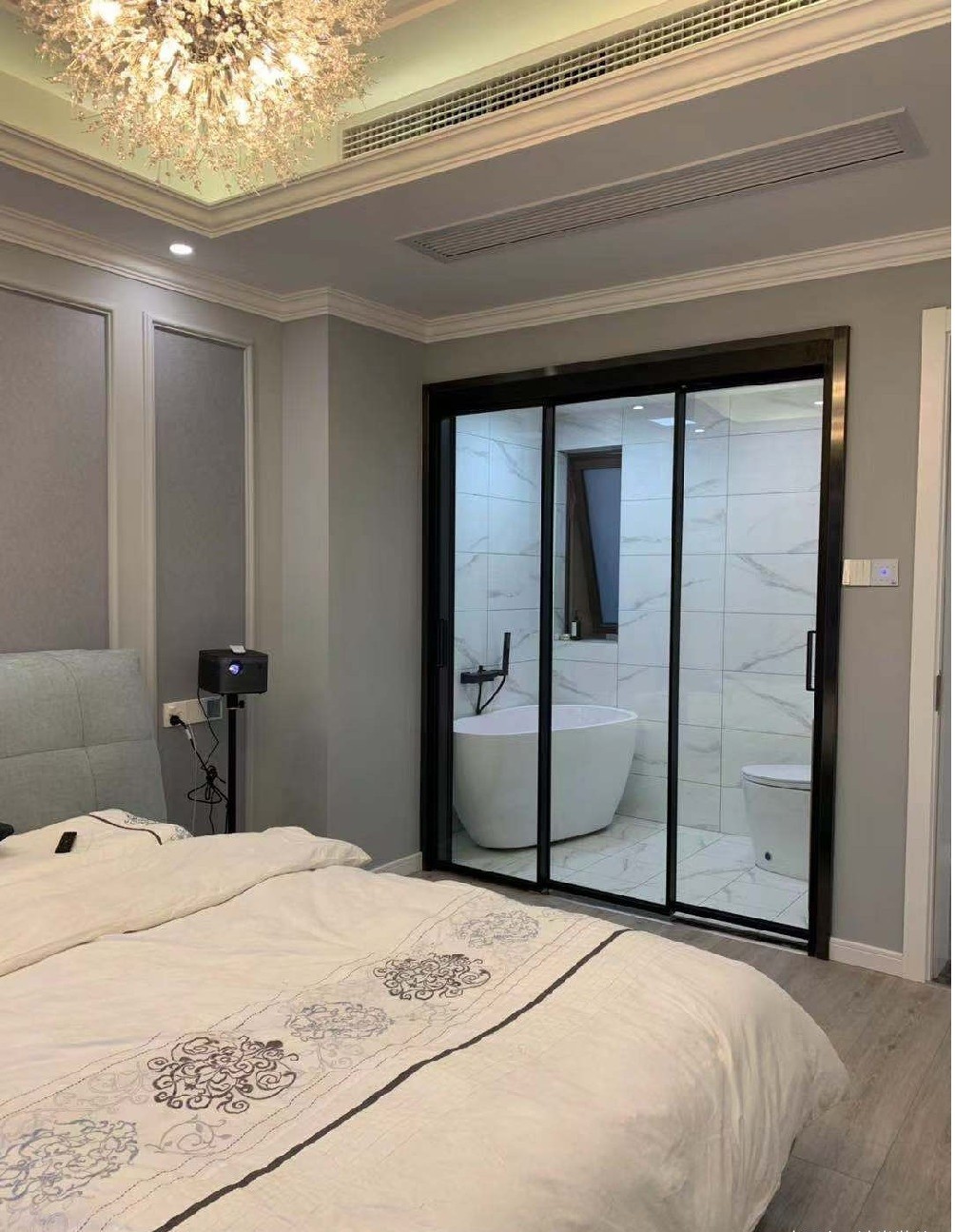 客户对主卧室的要求是整体空间清爽,简洁大方,落地的极窄边框玻璃移门爱上爵士白的瓷砖,造型浴缸爱上黑色的龙头。