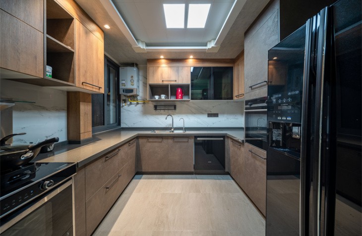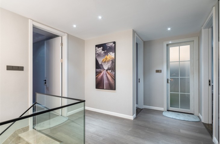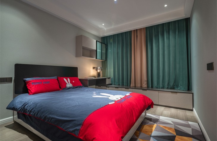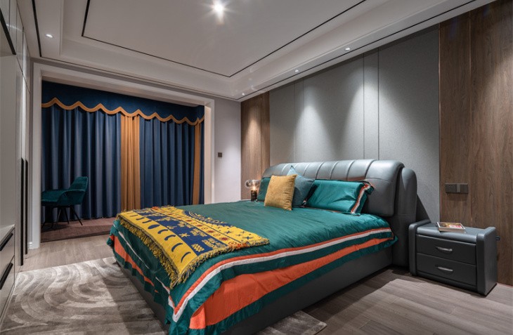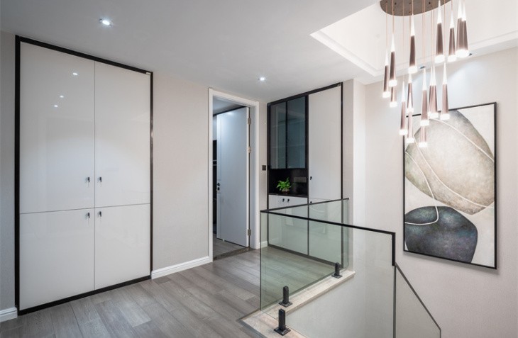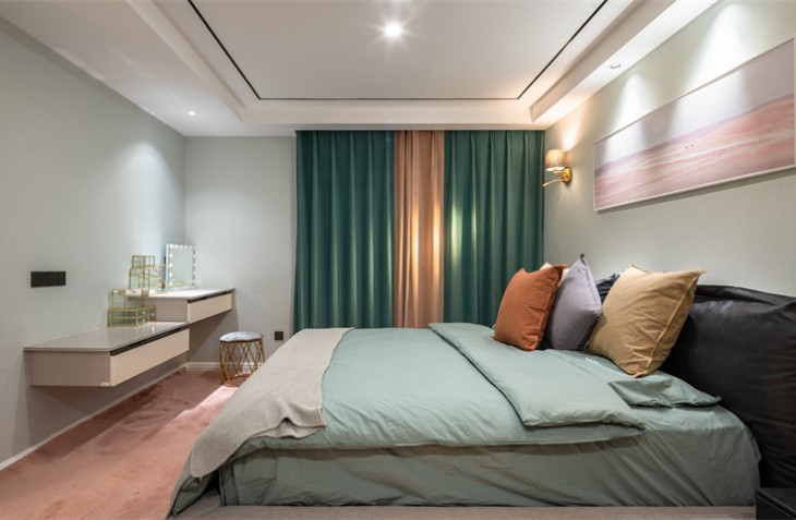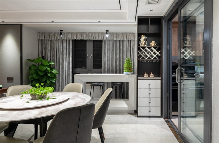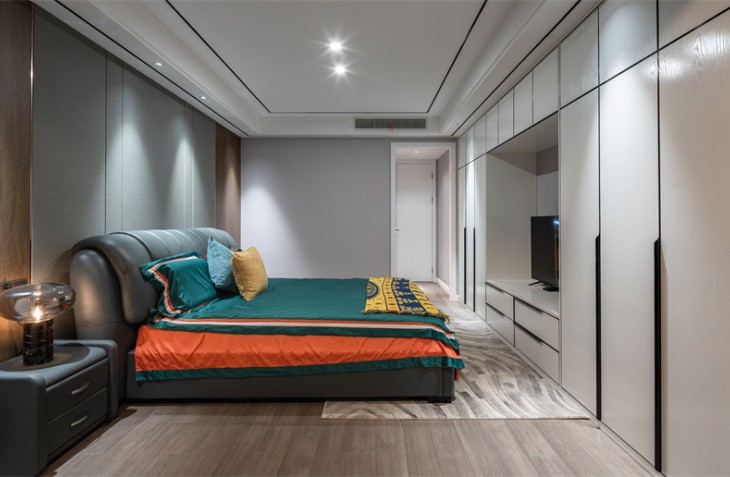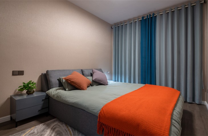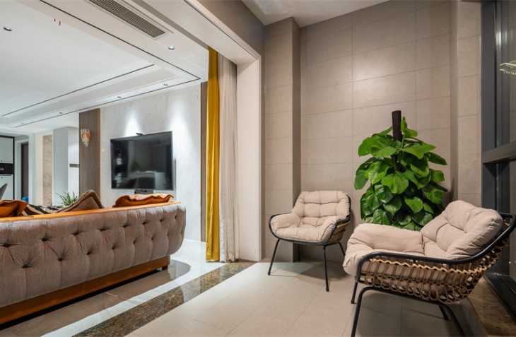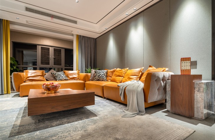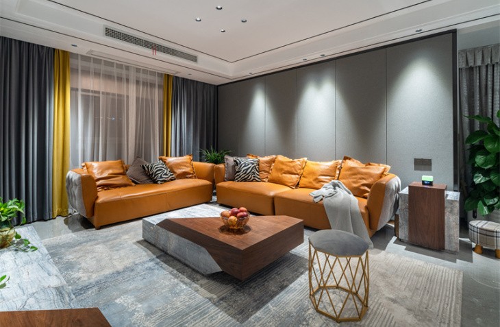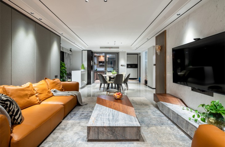 整体造型简洁明快,是当下流行的无主灯设计。生活需要做减法,设计也是。 黑白灰的高级搭配,彰显主人的审美观。灰白墙砖与灰色墙布,互相映衬,与灰色窗帘相呼应,鹅黄色纱帘与亮橙色沙发成为整个客厅的亮点,黑白灰中一抹跳跃,活泼而温馨。生活亦是如此,五颜六色,组成人生的精彩纷呈。