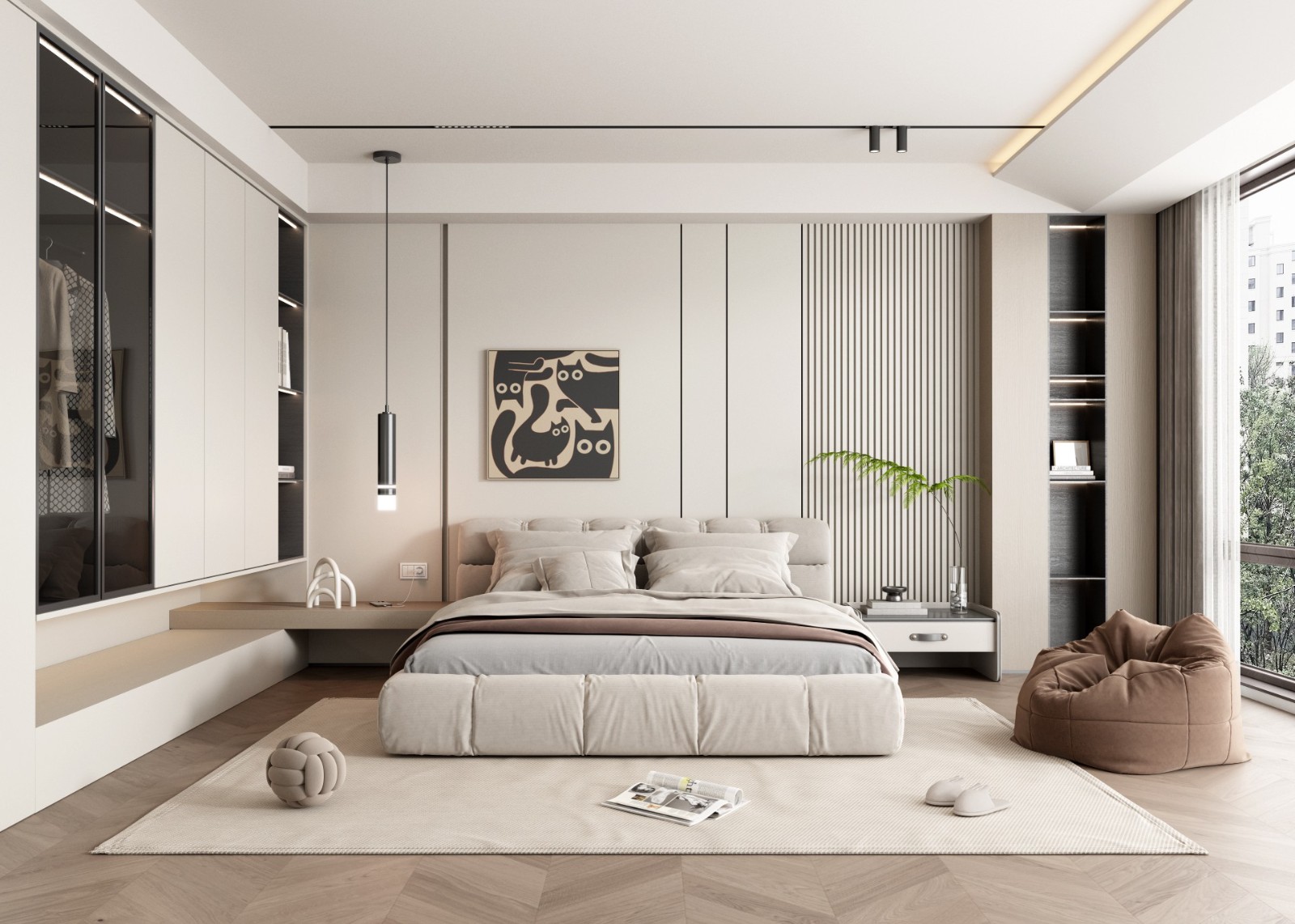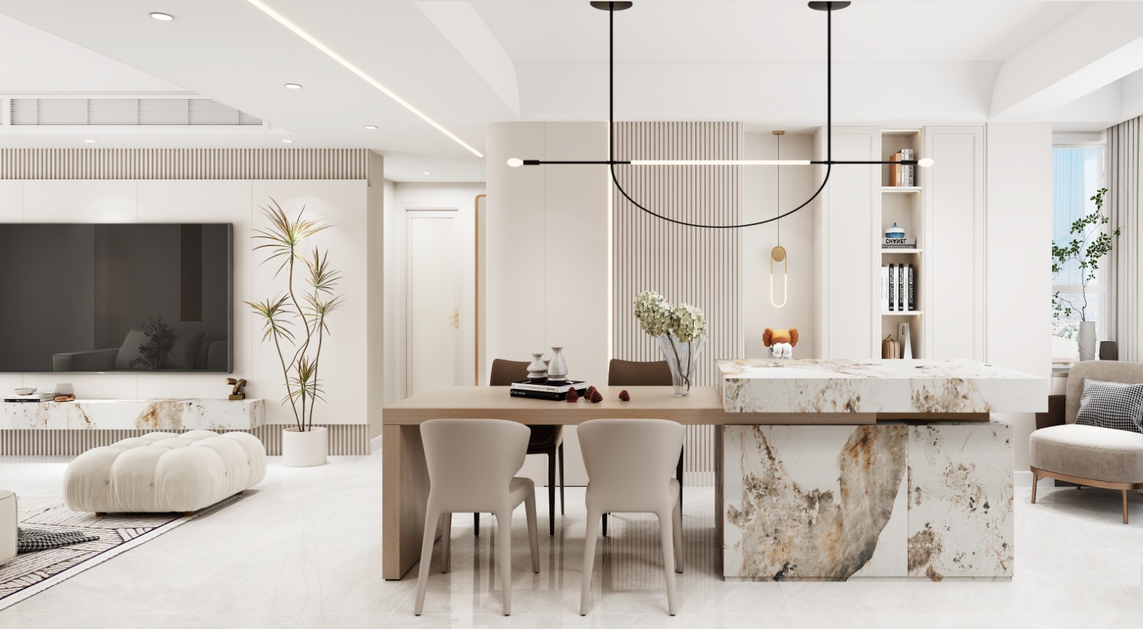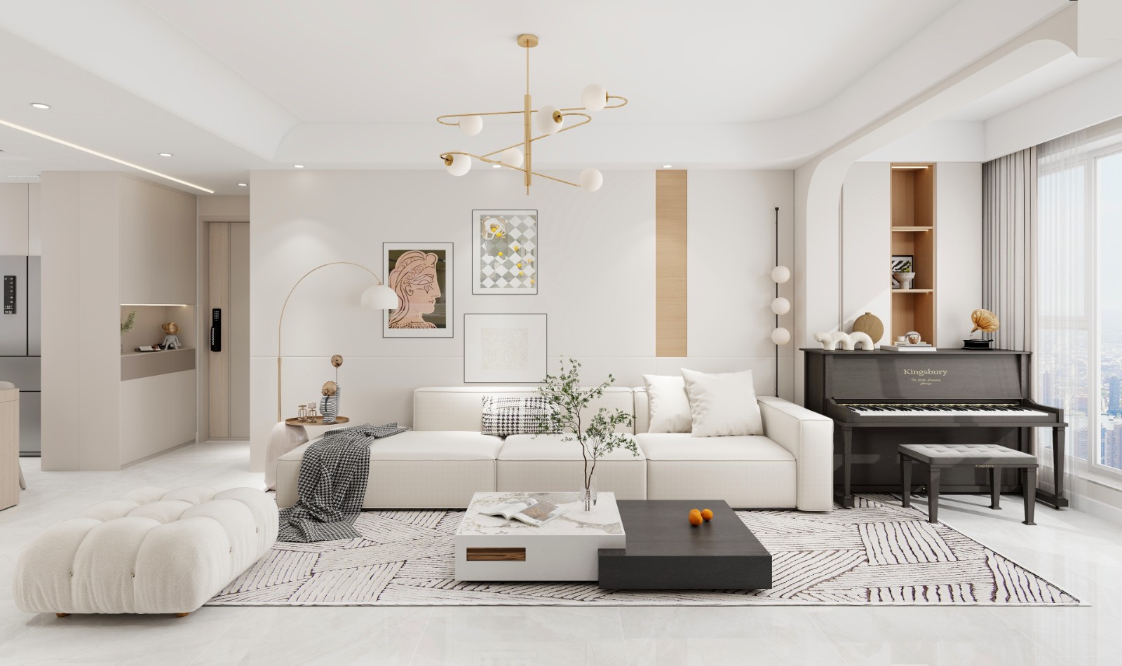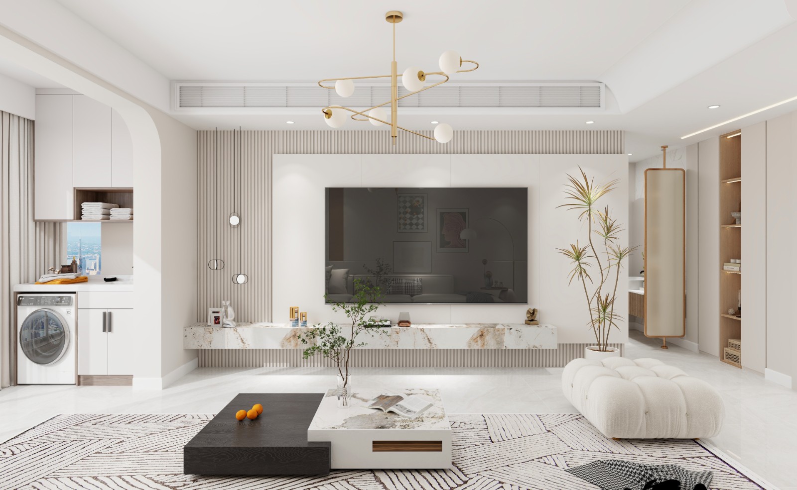 餐厅融为一体增加全家互动性,运用色彩搭配来改造这套住宅。优化客餐厅动线,引入自然光线;将电视屏镶嵌在白色的单个墙体里,使整个房间更具艺术感,并且让其空间性更强。棉麻布沙发,柔软而舒适,小茶几挨个摆放,抛却了繁杂的配饰为室内增加温馨的气息与活力。