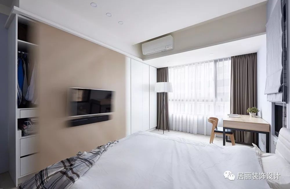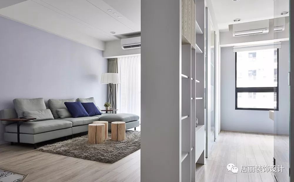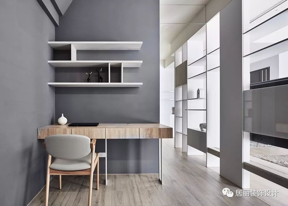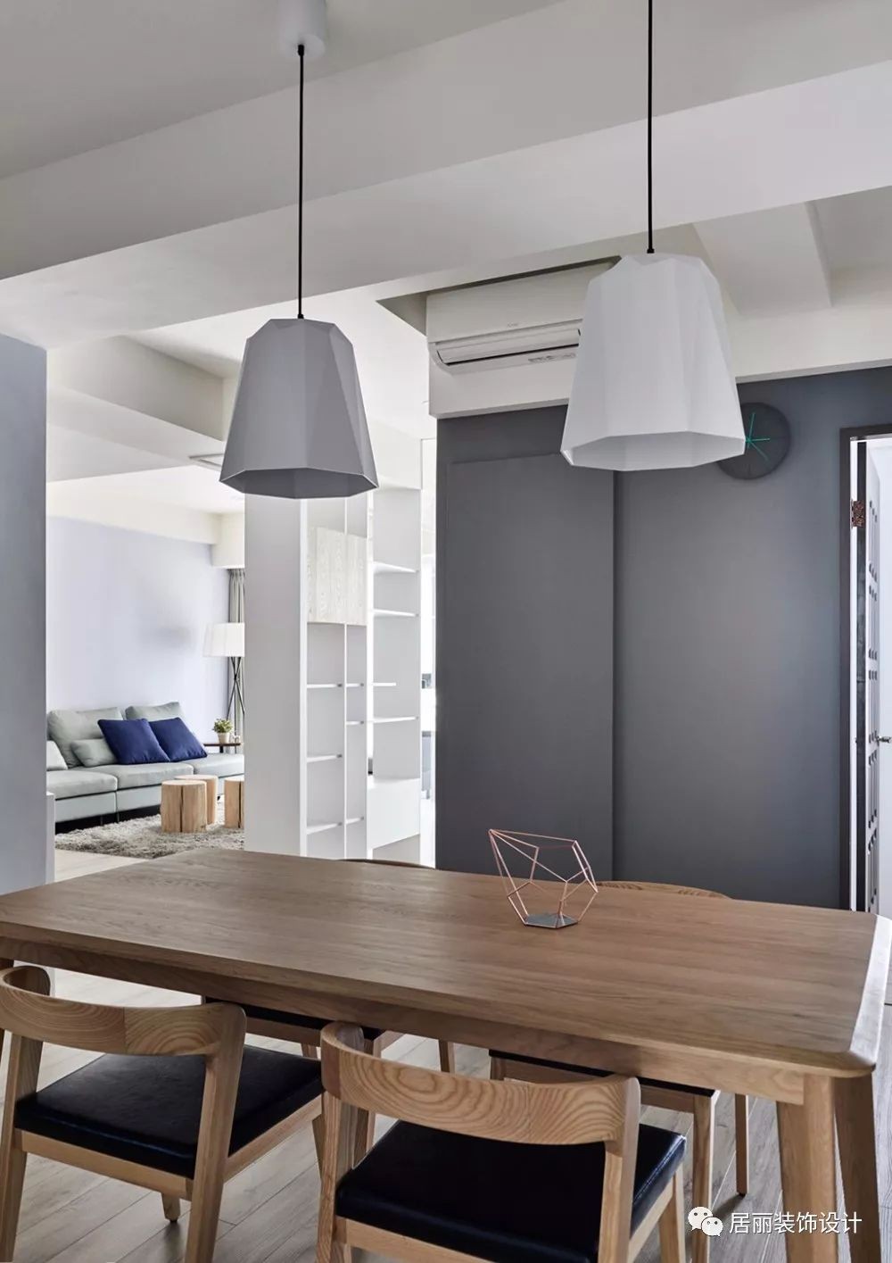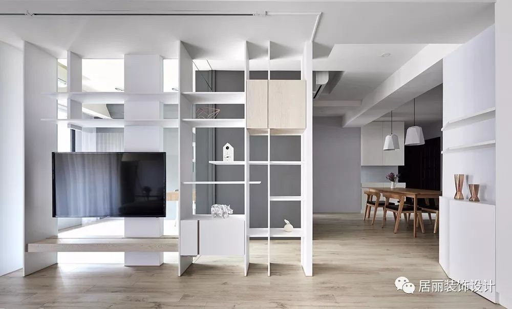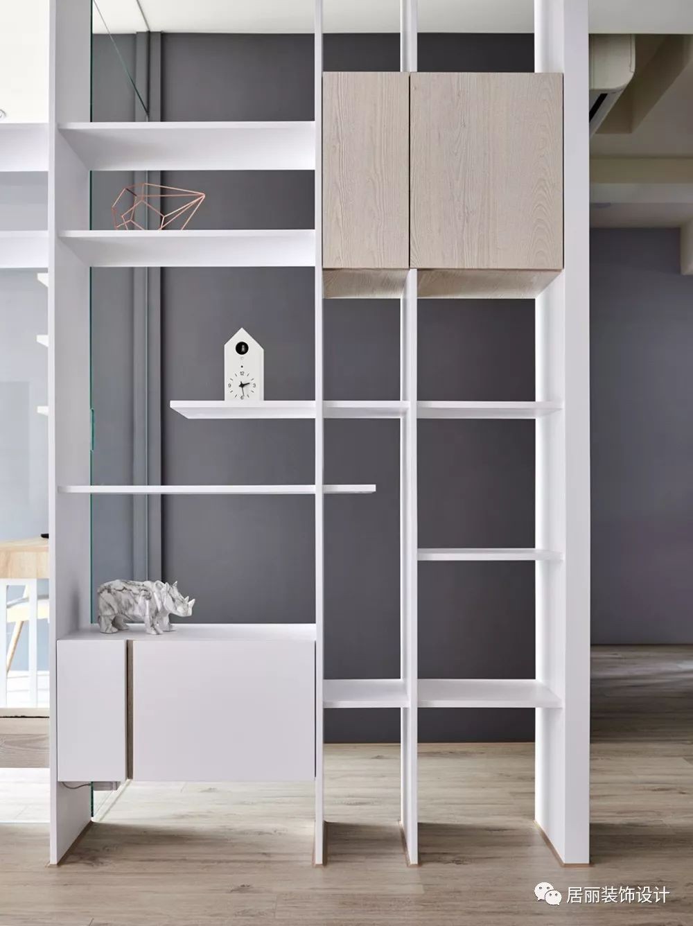 35坪的居家空间,既有格局促使餐厅较为黯淡无光,于是设计师将书房隔间打除,变更为层板书架,让场域光线得以相互交流,同时运用线条架构诠释现代风格,重启俐落而明亮的生活场景。