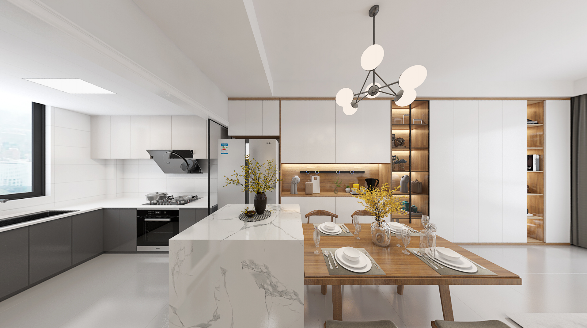 做为三口之家,活动的空间有是足够了,且本案的业主主打一个舒适,由于平时的工作繁忙,回家只想以休息为主,为减少干扰所以免去了视听功能,要的就是一个放松。设计师选用现代风格,进行原木色搭配,让业主在室内有一种身处自然的放松。厨房与客、餐厅之间的空间通过柜体的延伸连成一体,但又通过颜色进行区域分隔,让人在视觉上就有极大的轻松。