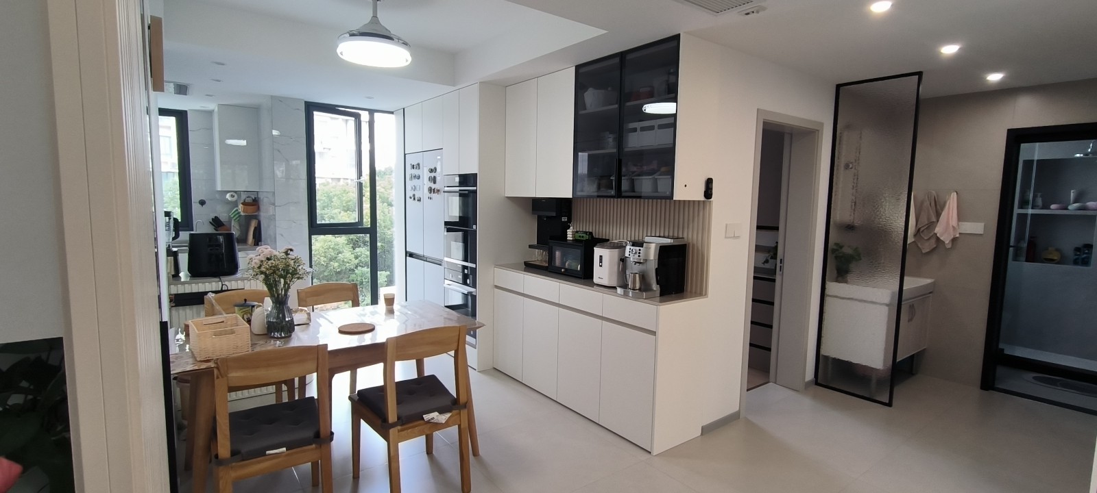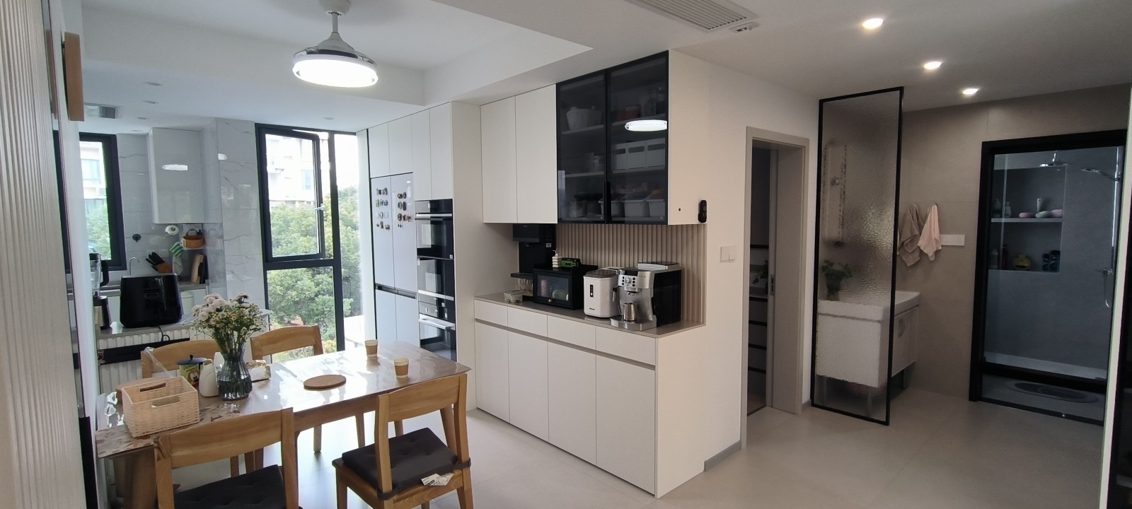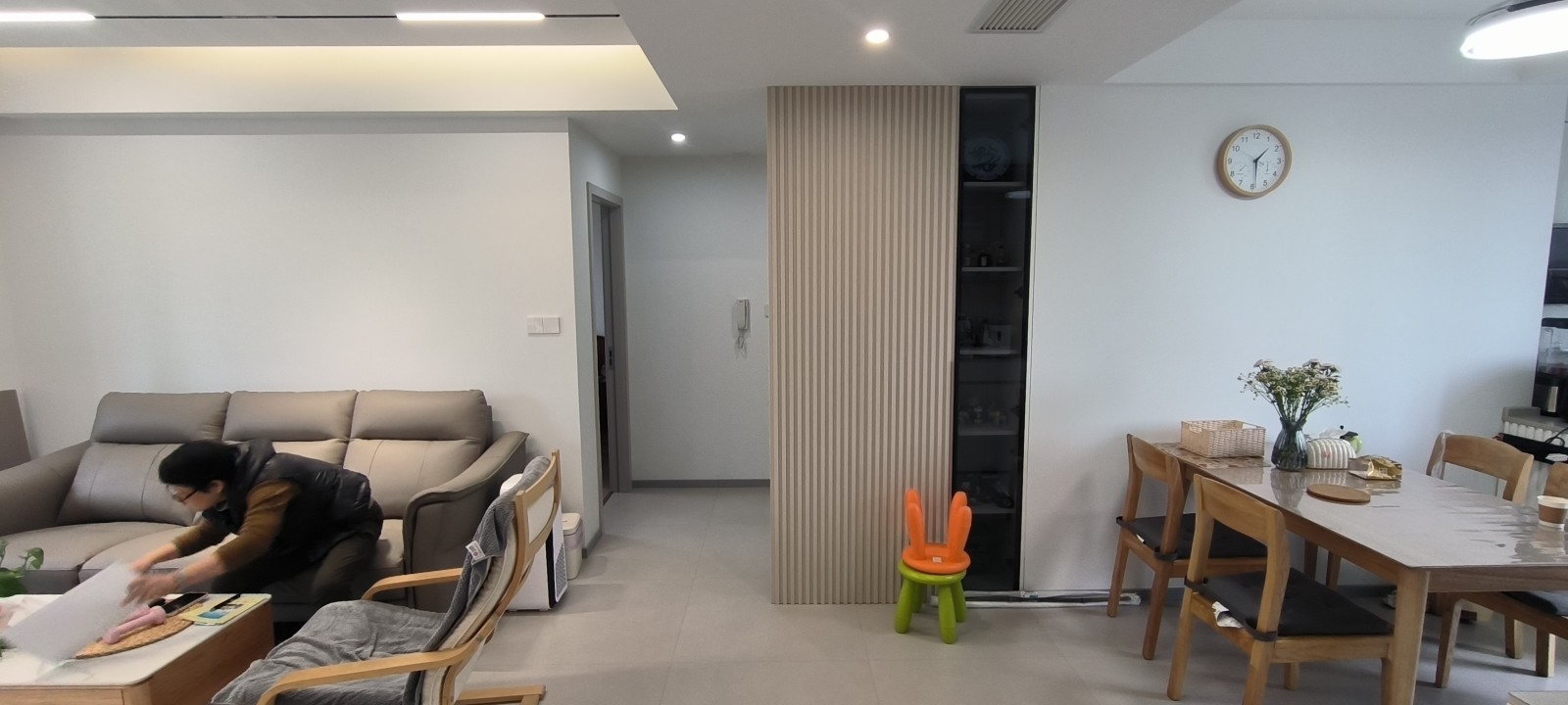 本案业主是一对夫妻俩,对生活需求是舒适、便利、温馨、易于打理,因为先生的生活乐趣广泛,需要家具储物与展示功能性的考虑。设计师采用混搭风格,入口处采用半封闭式,提升隐私性,用玻璃门板柜体作为展示功能,便于展示与打理,原木色风格让整个家庭更加自然与惬意。