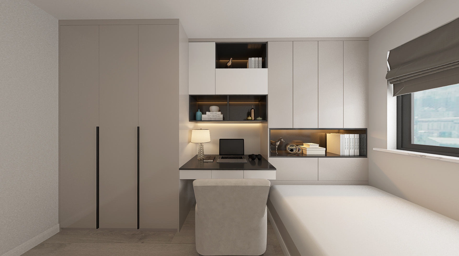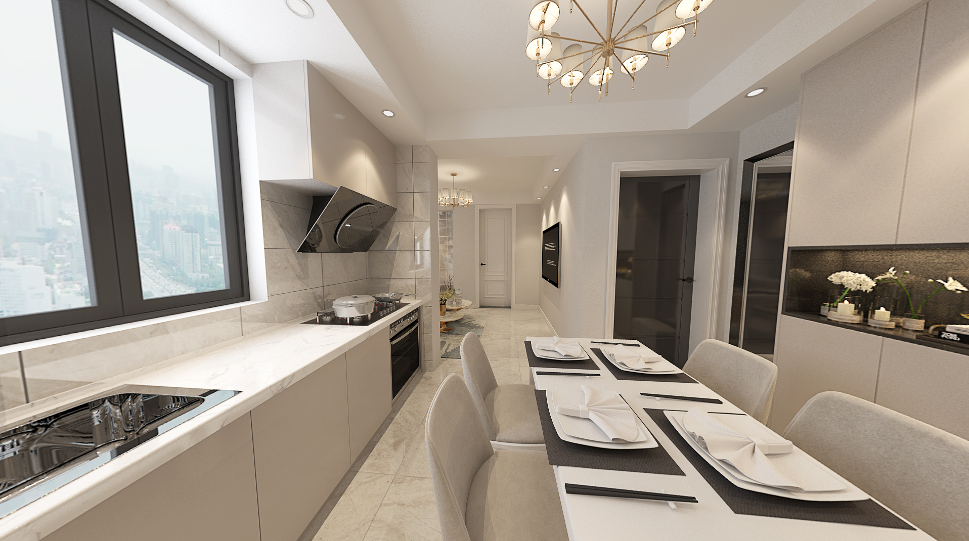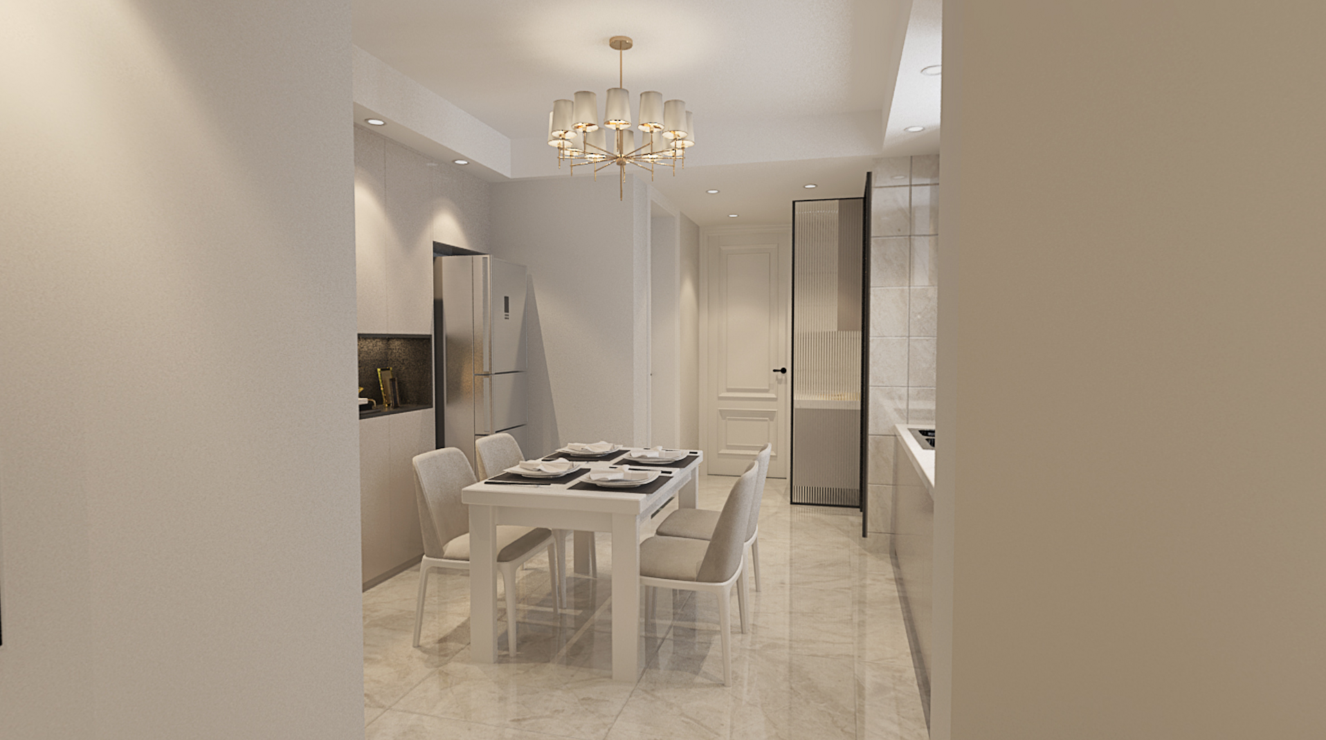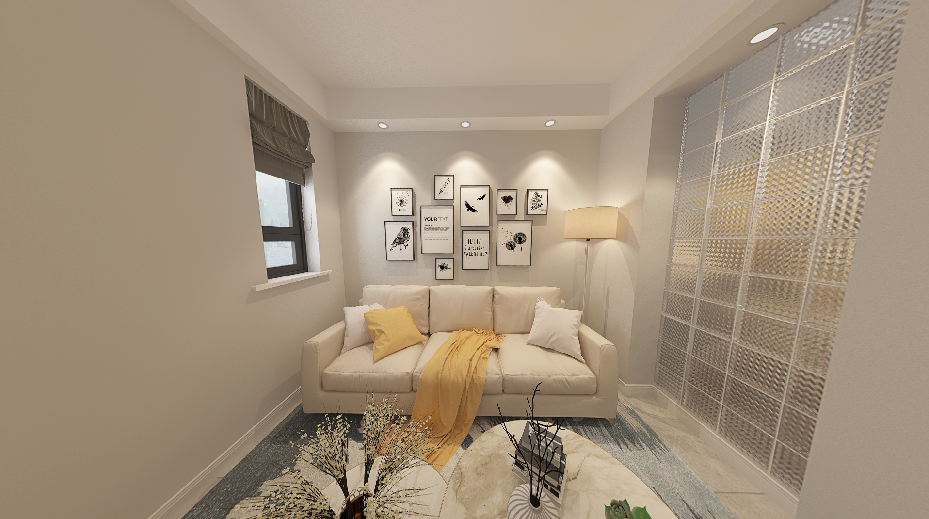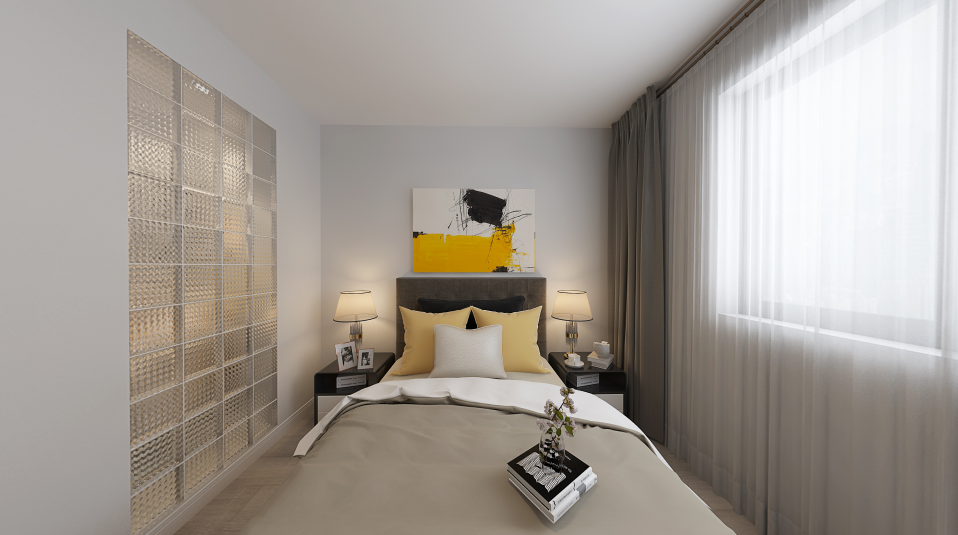 本案是房屋类型是三房一厅一厨一卫,需要满足基本的功能性需求,同时对采光方面有一定的要求。在对现场勘察之后,设计师考虑到客厅空间的采光性较弱,选用玻璃砖做了房间隔断,增加采光面积,让客厅更加明亮,在用火较少的情况下选用敞开式厨房设计,让餐厅与厨房空间容为一体,整体性更强,房间则更具需求的不同做了不同的色调搭配,让其更与房间主人更加协调。