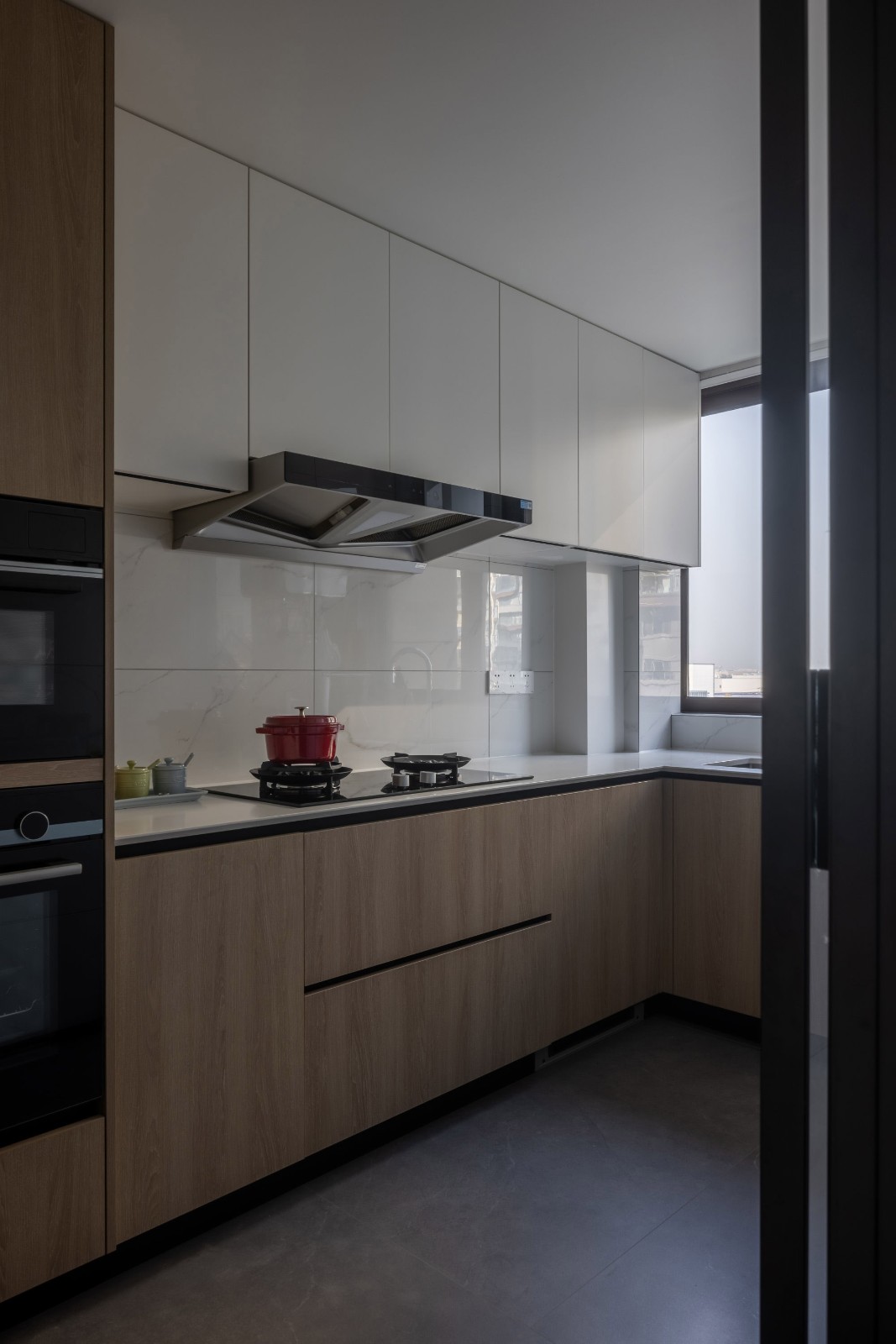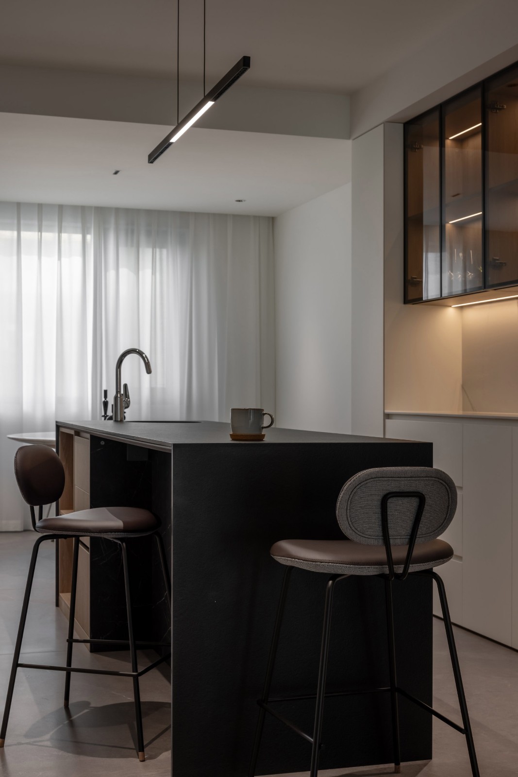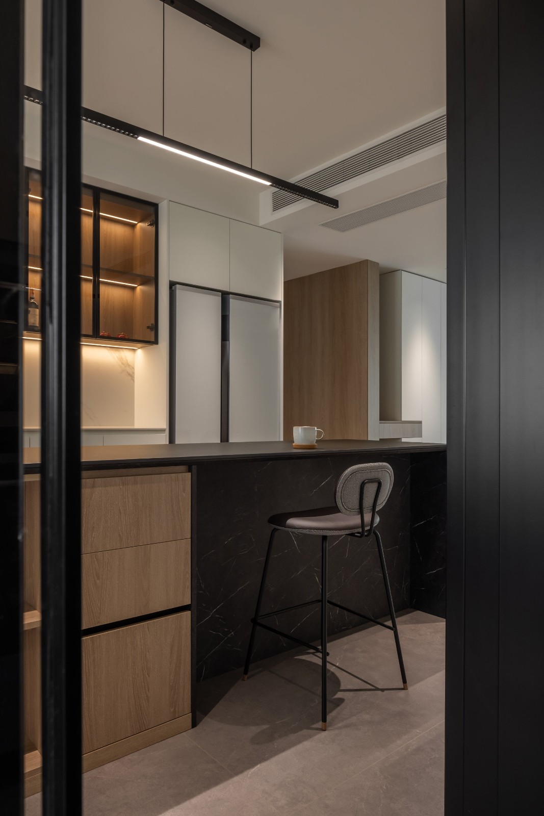 包边黑框将人的视线引向厨房,厨房也是展示品位的重要领地,它的设计追求功能与收纳的最大化,内嵌式洗碗机、蒸烤箱等厨电,使得空间更简洁,线条更流畅,井然有序,干净利落。