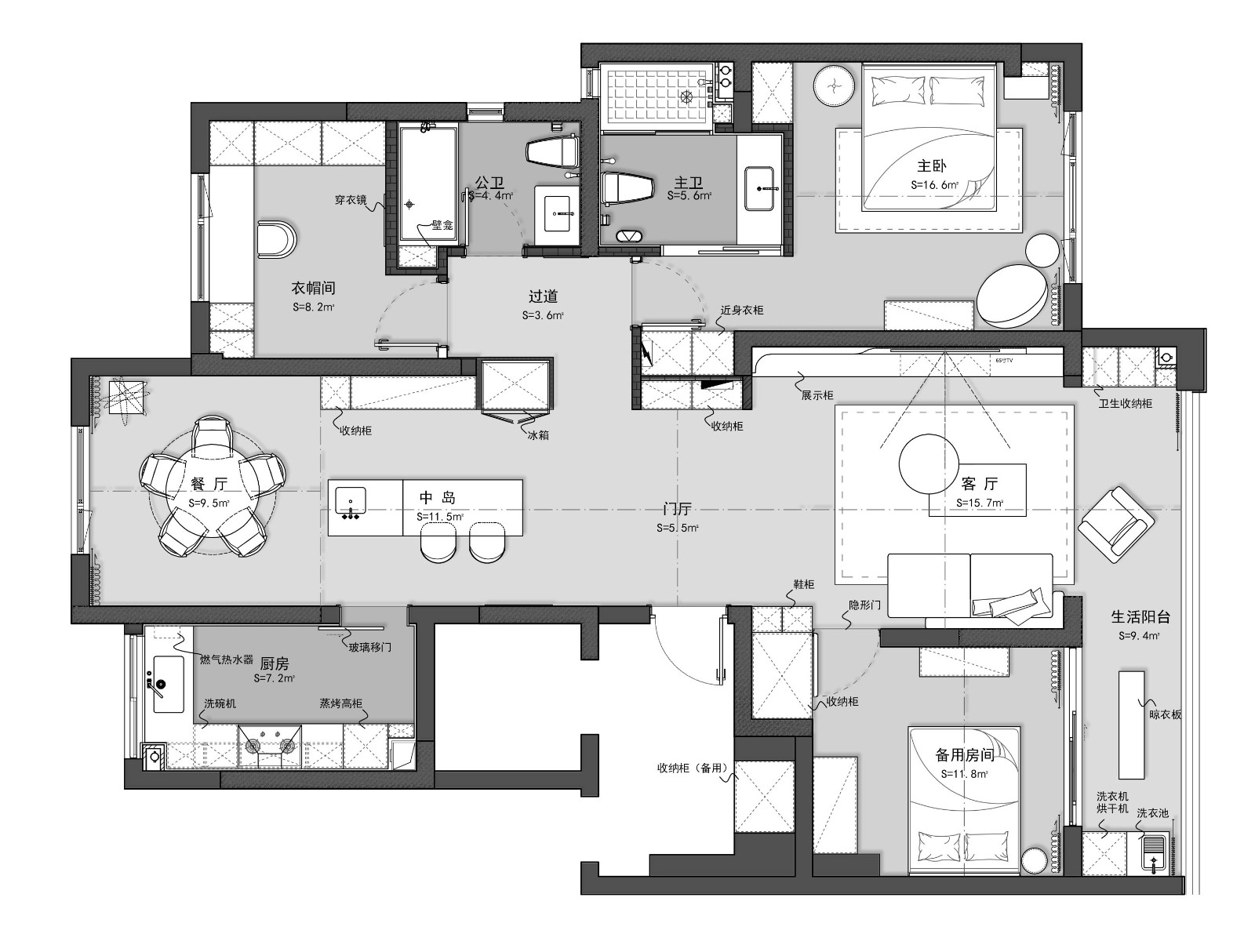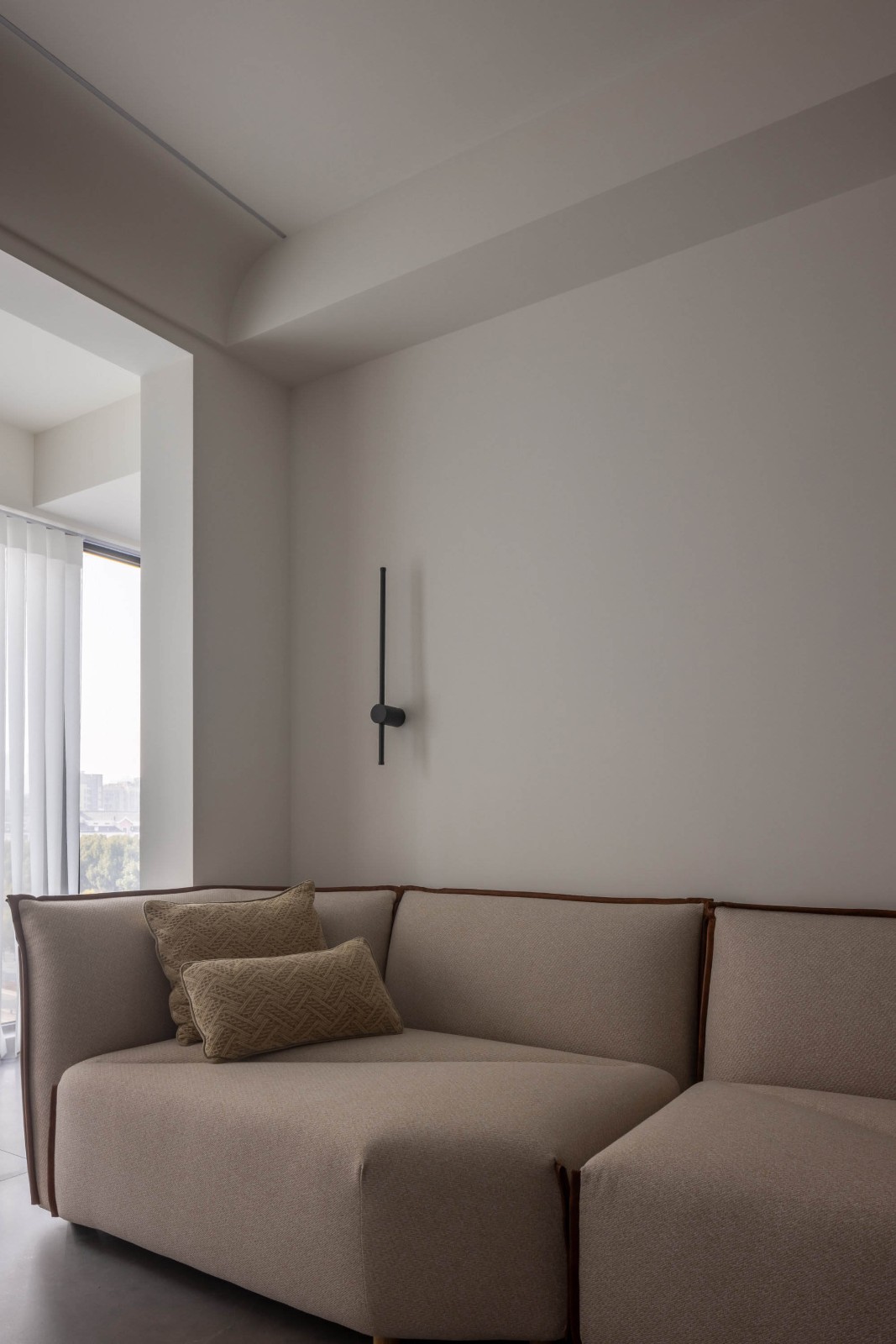 客厅没有茶几,意味着未来的无限可能,两张户外休闲椅代表着对自由的向往和追求。洗衣晾晒功能的巧妙隐藏,保持了空间的整洁与雅致。