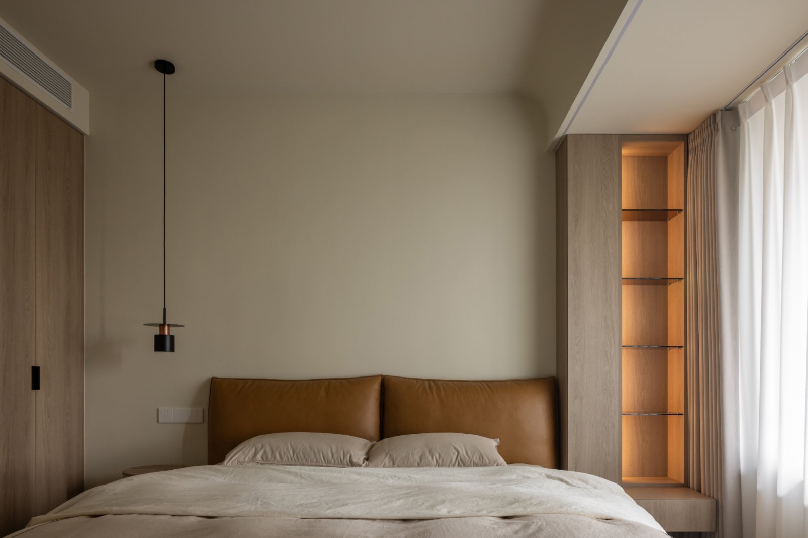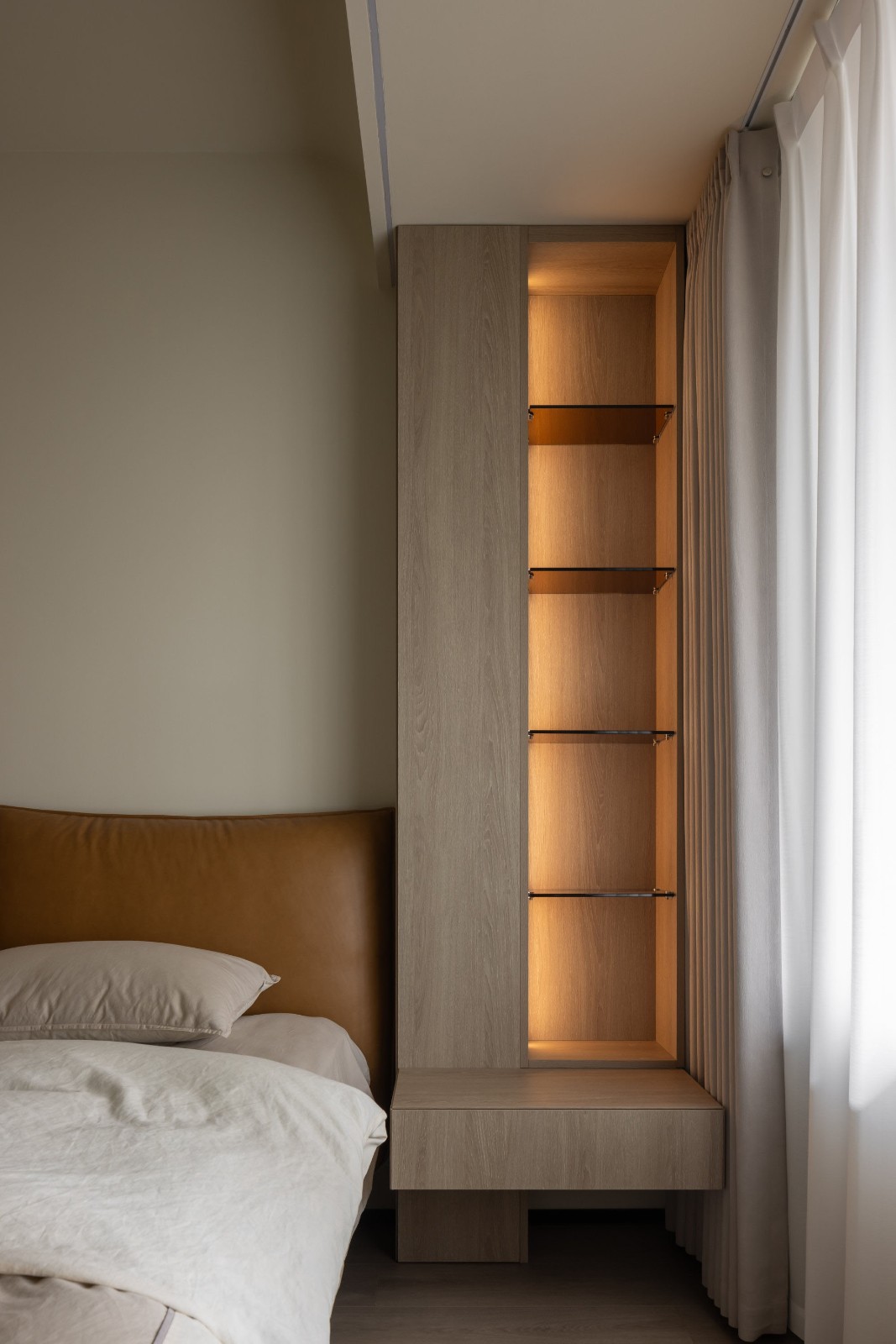 主卧巧妙利用原有墙柱结构,增设床边展示收纳区域。