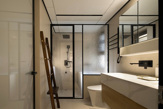 主卫将原卫生间进行分割,增加了日式浴缸区域,增加双台盆,满足同一时段多人洗漱的需求