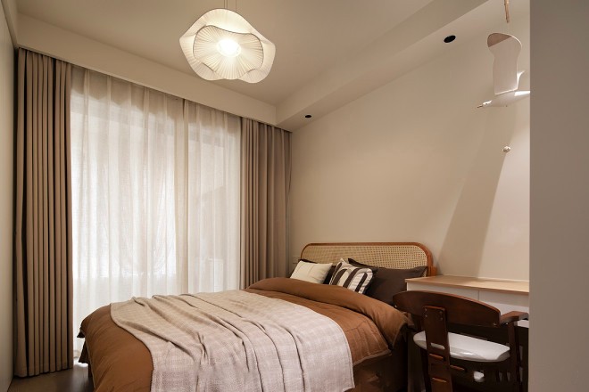 在主卧,没有繁忙的生活,只有自然栖居的宁静与放松。设计师选用同色系地板,与奶油色墙面相融合,营造出统一精致的视觉感受。