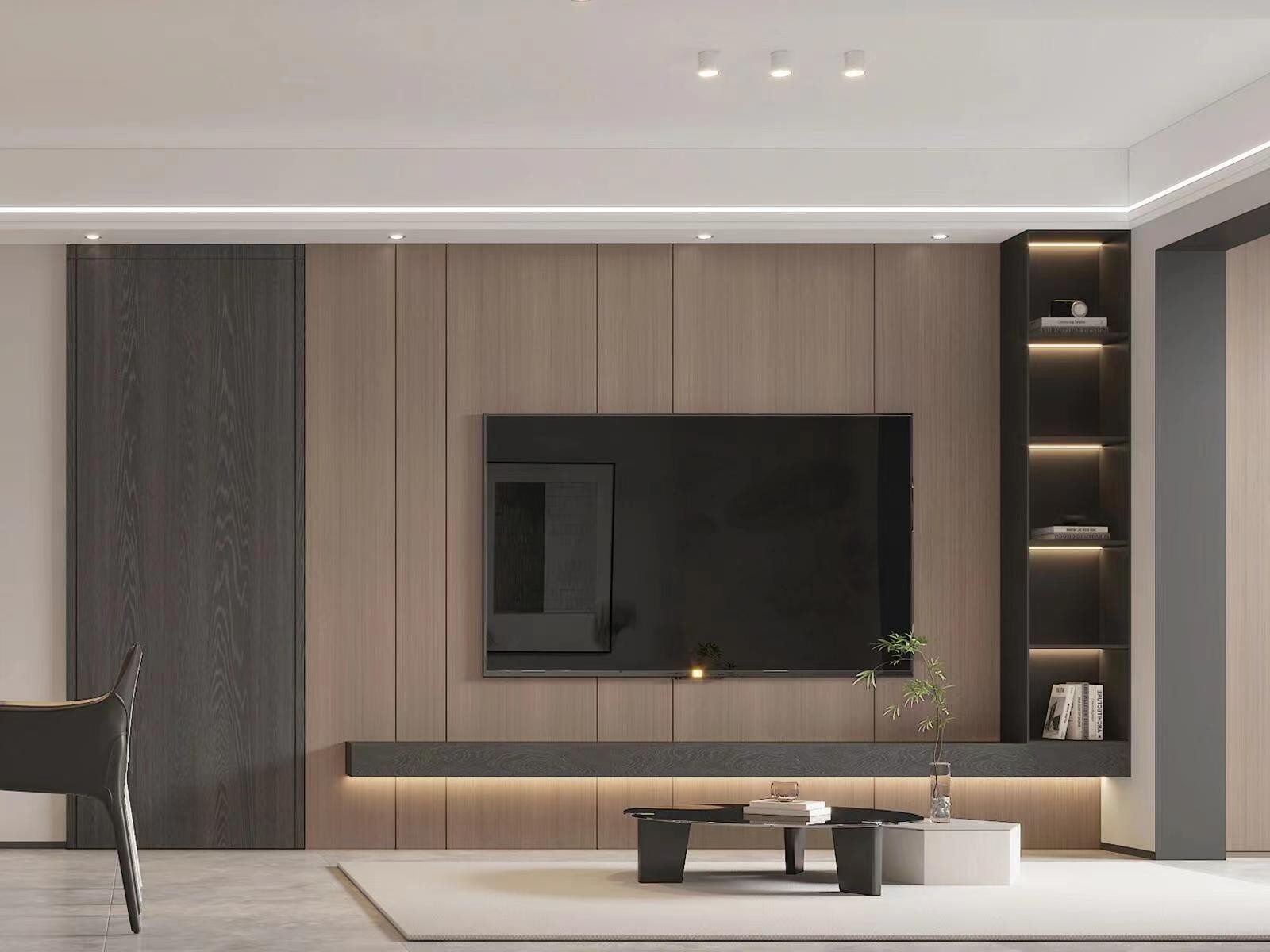 🌥电视墙用木纹做打底,右边做一组棕色的收纳格来增加整体的物品摆放和空间的收纳,下方搭配上棕色的悬空电视柜,方便日常的清洁打扫。