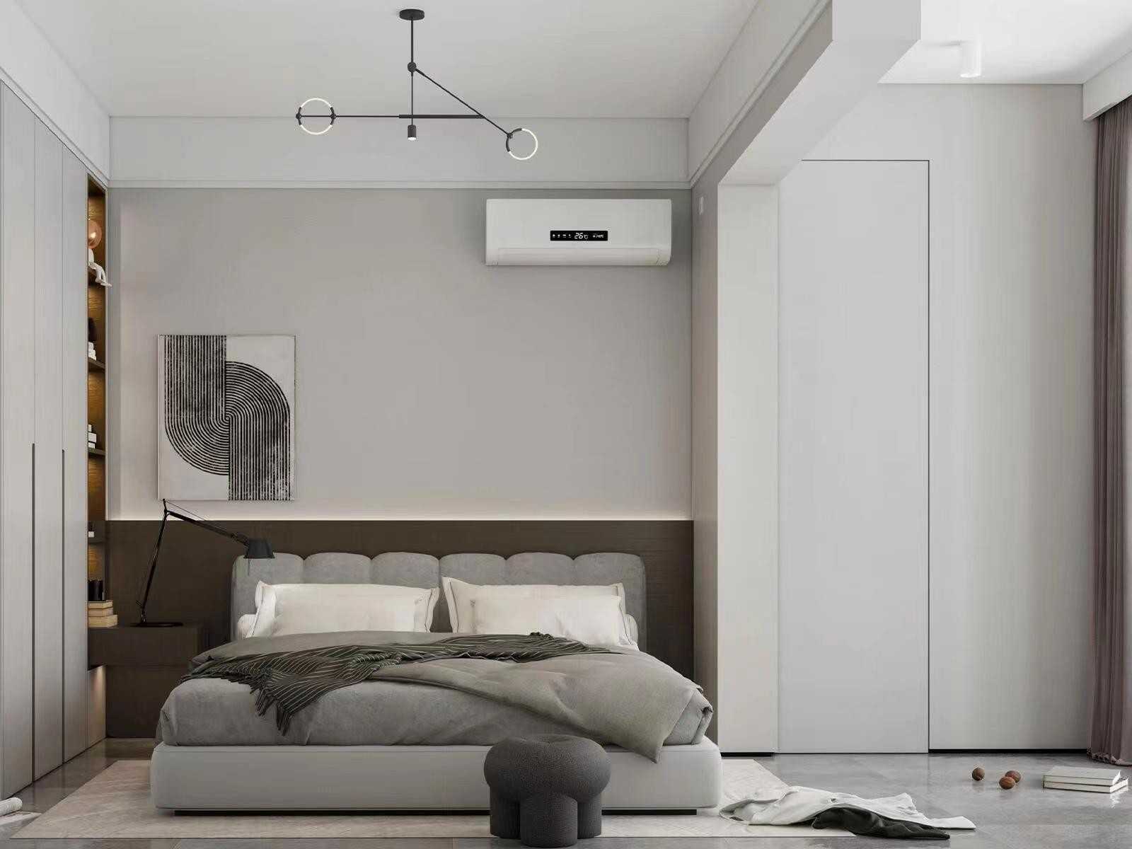 🌥卧室背景墙以奶油白为背景,营造温馨氛围,床作为卧室的重点,采用黑色与灰色质感,自然成为视觉中心窗户采用黑色边框,增加主卧的厚重感和线条感,而又不失和谐。