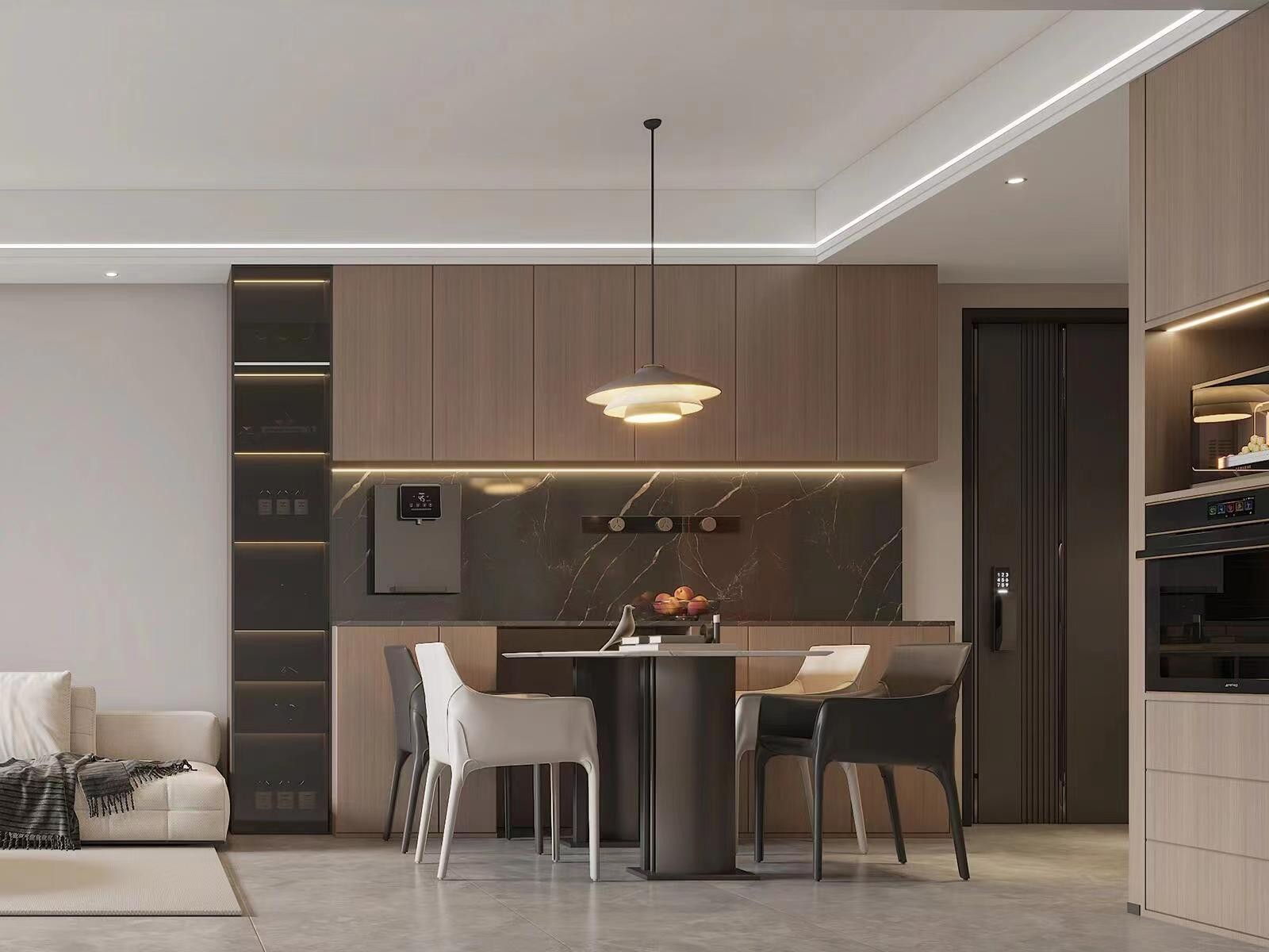 🌥客餐一体式的餐厅区域可以使空间最大化的利用,餐厅上方的环形吊灯增加了许多的氛围感,再结合上侧面的定制餐柜,不仅增大了整体的收纳空间,也方便日常的物品摆放。