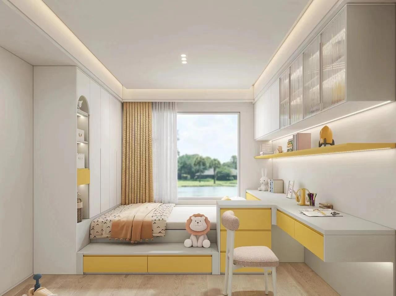 儿童房做榻榻米+衣柜+书桌柜设计,不仅整体性强,而且很实用,睡觉、储物、学习都能满足100