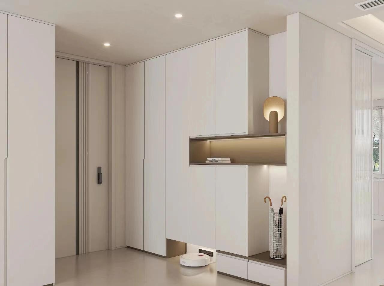 进门定制到顶柜,中间留空放钥匙,底部还给扫地机器人做了一个“家”,整洁又干净,喜欢喜欢