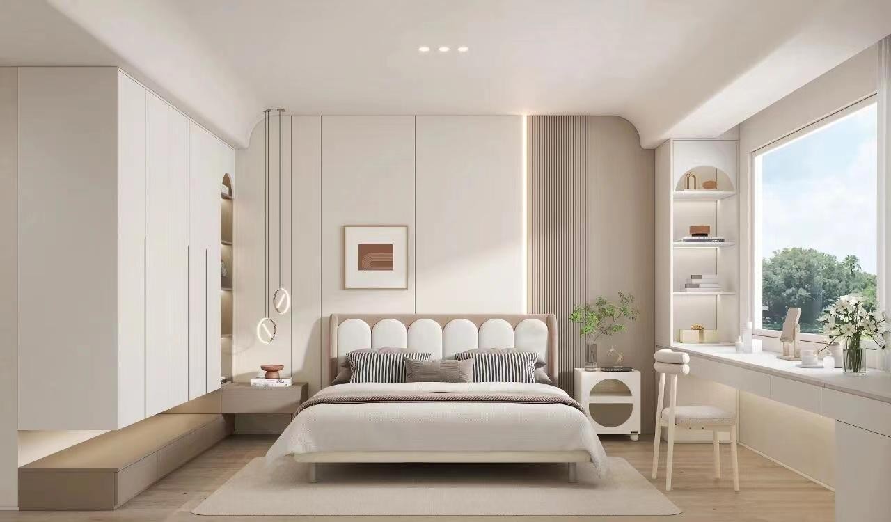 主卧 讲真,悬浮衣柜+地台超有设计感!!靠窗定制储物柜+台面,办公梳妆都可以,实用到失语!