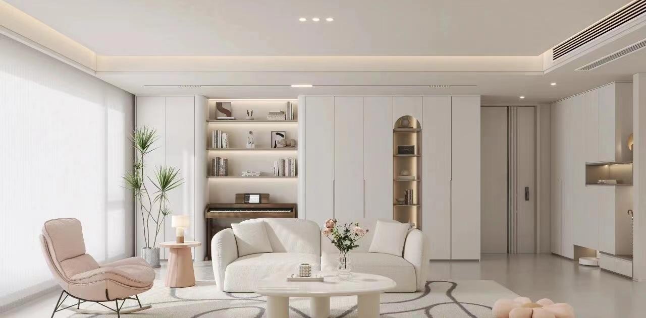 电视柜+储物柜都是一个系列,搭配木色开放格和灯带增加层次感,再配上绵软粉嫩的沙发,甜到心里去了