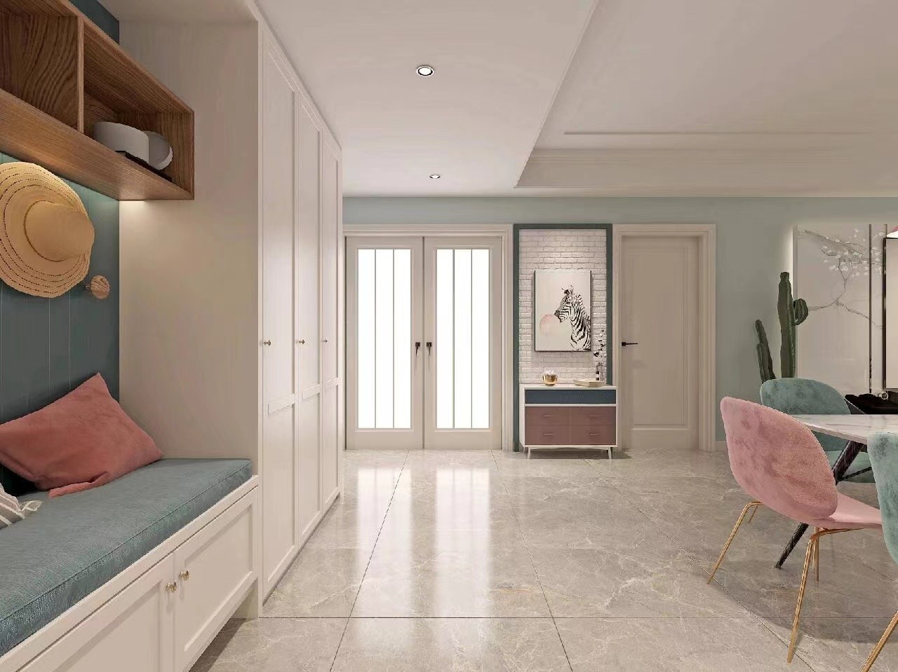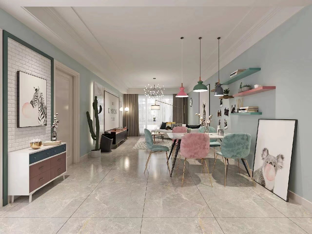 客厅背景墙统一采用淡蓝色的预调乳胶漆,搭配着莫兰迪色系的软装家具,突显北欧风格的特色,也让空间简洁、干净。