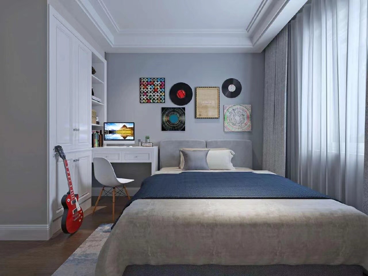 次卧室房间采用衣柜+书桌一体的形式,这样空间利用率更高,孩子的学习收纳空间也增加了。