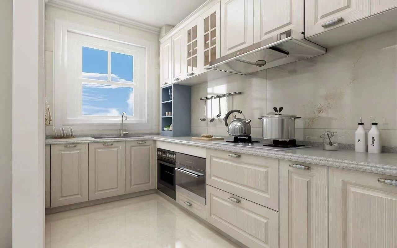 厨房U字型设计最大化利用空间,大面积留白,包括地面与墙面,靠软装色彩来突出亮点,阳台下水管采用柜子包管连接柜子做了开放格加一些灯带处理,增加收纳