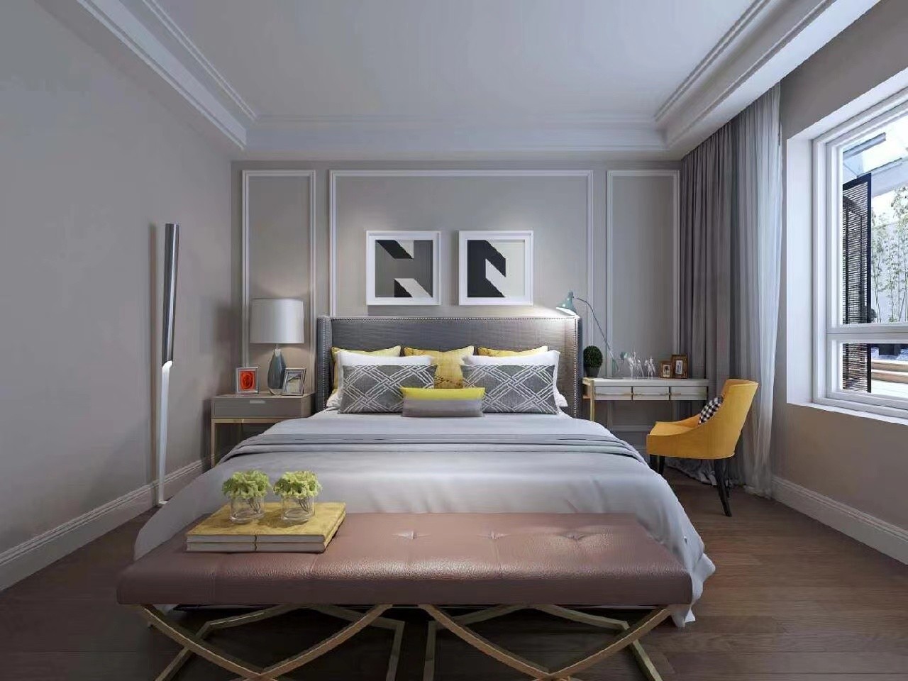 卧室空间较大,采光很好,简单的吊顶,只需要从材质和色调上与整体风格配合,不需要过多华丽的造型,床头增加了一个吊灯,是视觉感上增加了一个亮点。