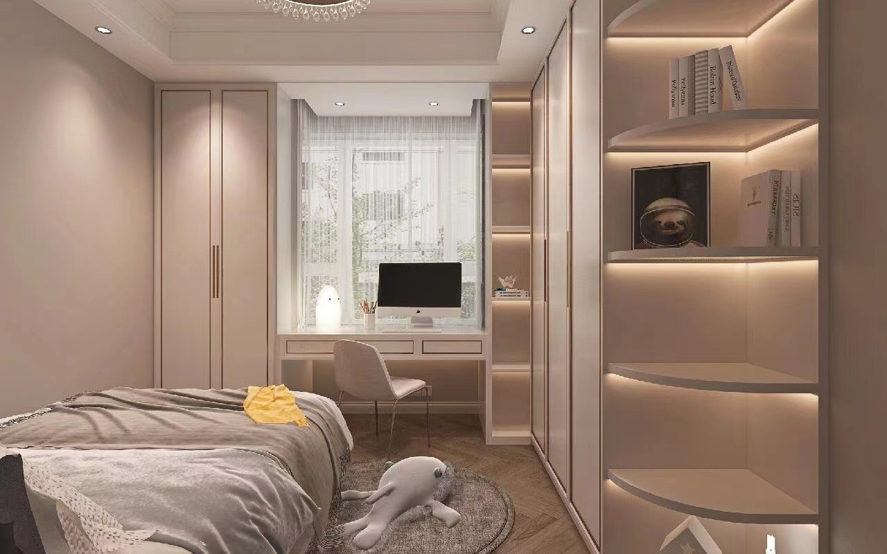 儿童房颜色就比较偏明亮一些,因为这个卧室在北面,采光稍微有些不好,而且是儿童房,不建议用深色显得太压抑