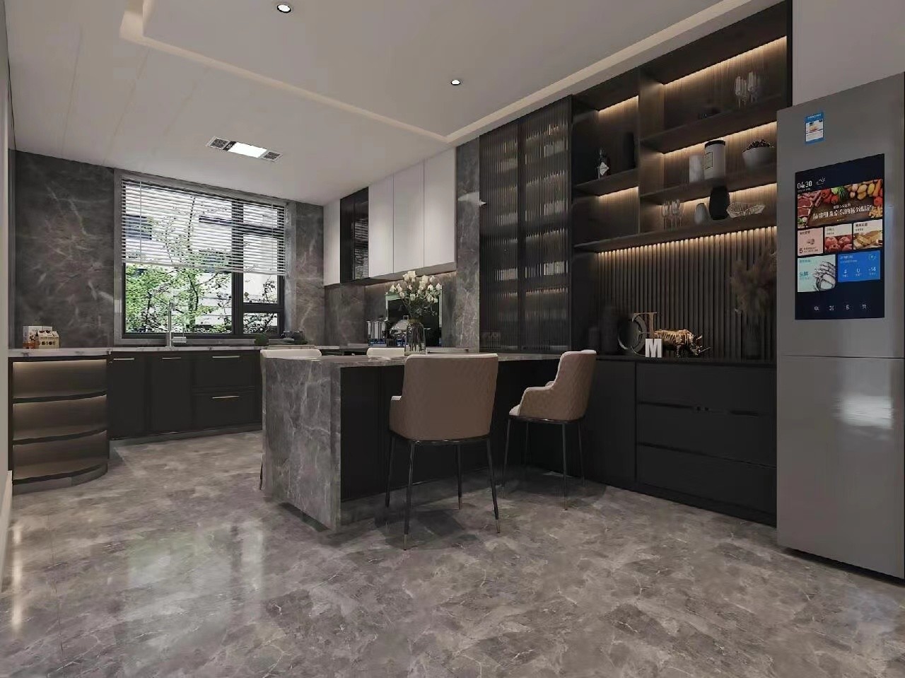 客厅地砖用了稍微冷一点的灰色系,电视背景墙做了隐形背景墙处理,显得更大气,沙发背景墙用了偏美式一些的感觉,融合了一下刚刚好,业主比较喜欢收藏一些小零食,在客厅位置做了一个零食柜,作为收纳空间来用