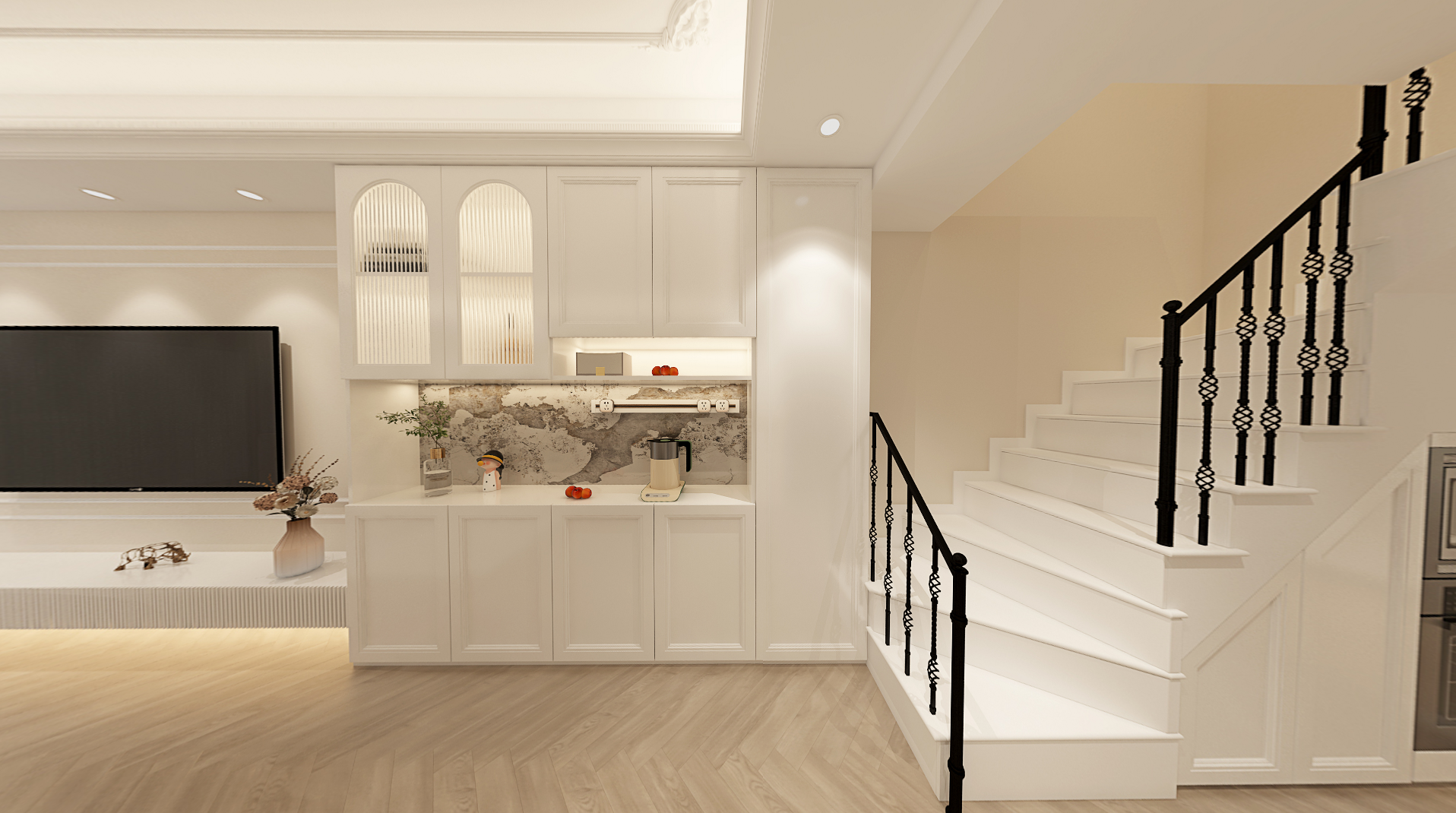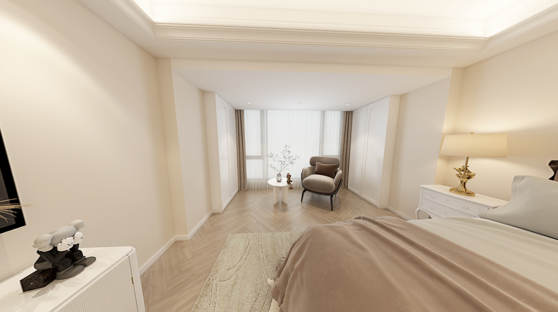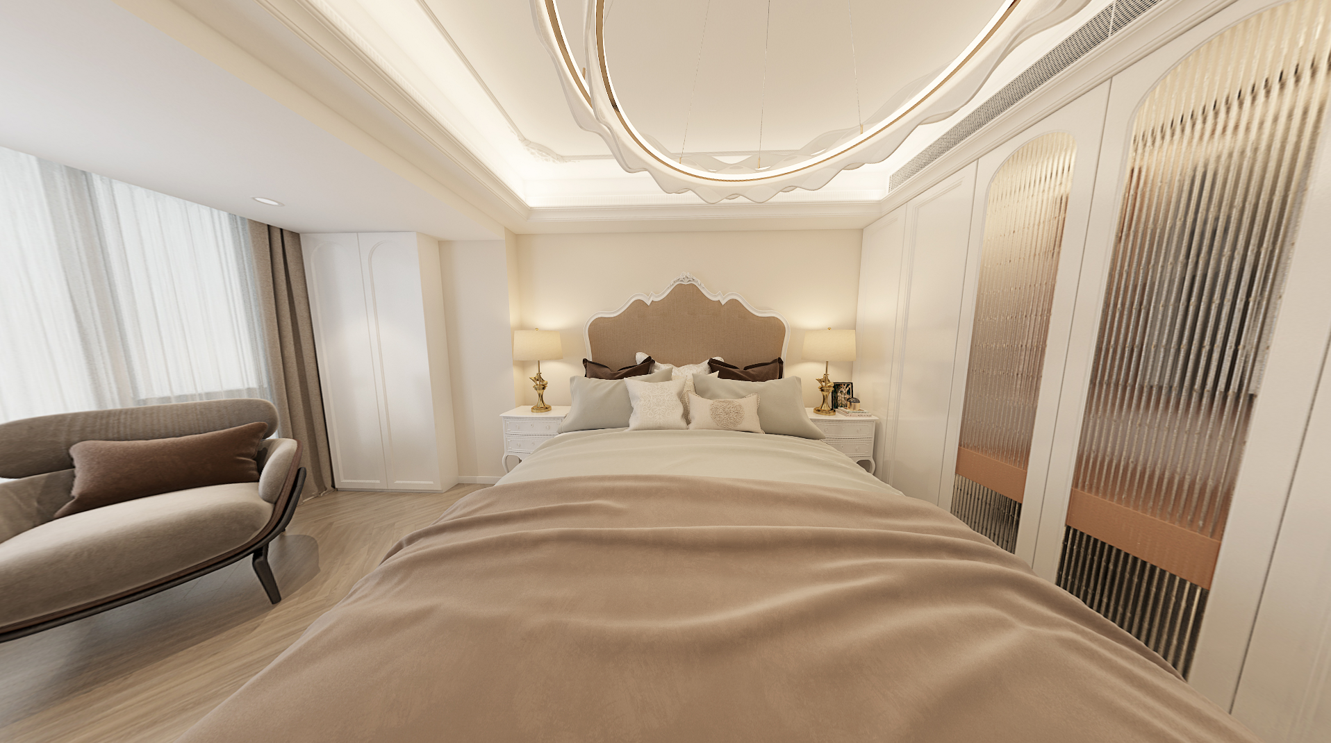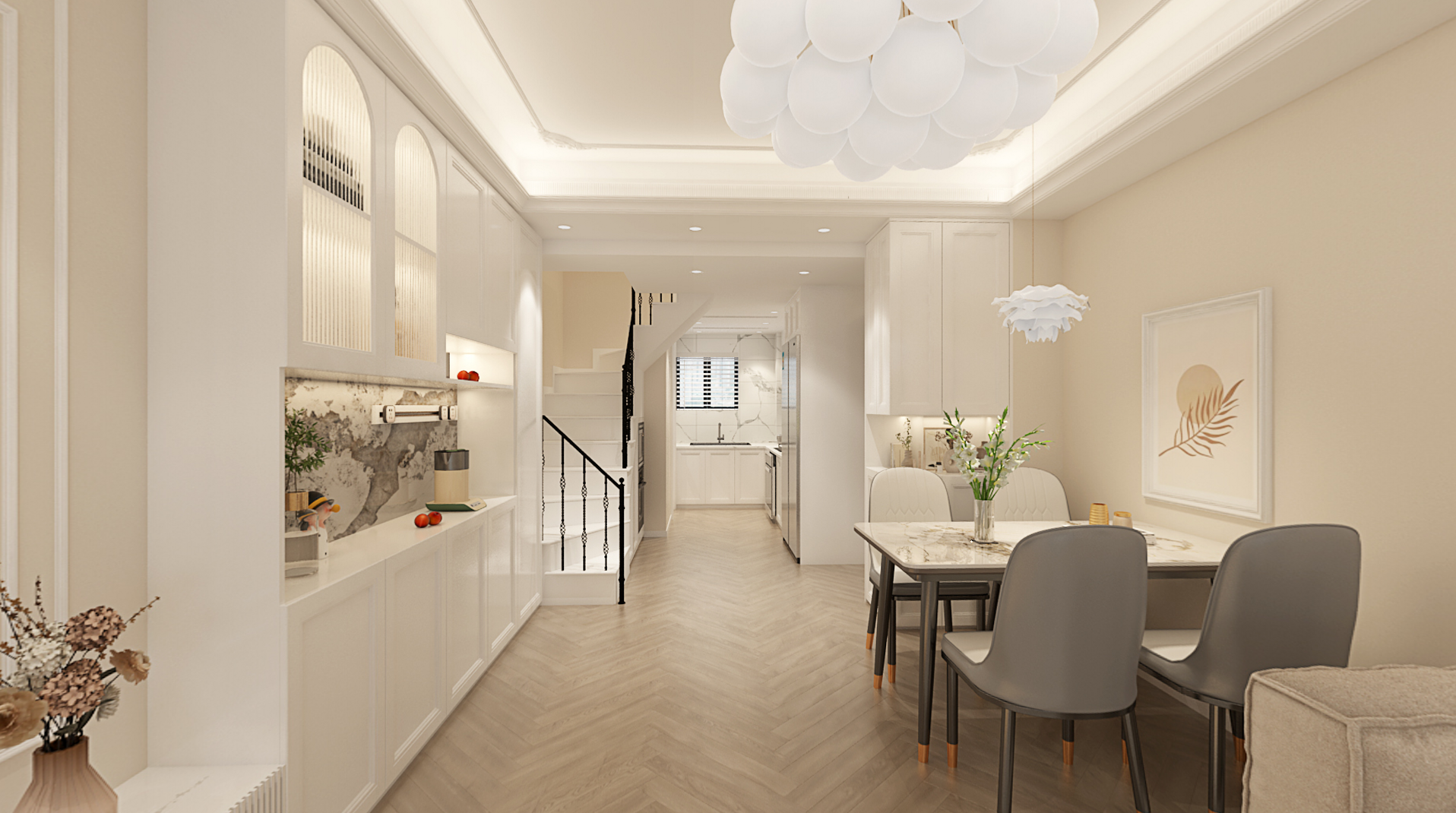 本案户型复式结构,业主需求法式风格,储物功能要多,开放式厨房。 有了明确风格,设计师更加考虑的是储储物与美观的结合,室内采用温暖柔和的灯光,地板上选用人字型暖色系铺设,与墙面暖色系涂料相响应,让置身于室内的人时刻被温馨的颜色包裹,让人身处其中就会快速放松下来。 客厅顶部的园型花盘和吊顶内的角线,空间内增添的金属线条,柜体在有限的空间内选用一些简单线条的门板,让整个空间拥有轻奢感。 儿童房与主卧则因为使用功能的不同做出了明确的风格划分,儿童房除了睡觉还需要一个舒适的作业区和玩具和书本的储物空间,在设计过程中,为了避免空间的压抑。空间也选用一些明亮灯光设计,保持光线通透。在柜体设计过程中设计开放式柜体,增加室内纵深,让空间错落有致。主卧其空间主要是睡觉,家具和空顶部园型角盘一致,使整个空间容为一体,增加睡眠体验。