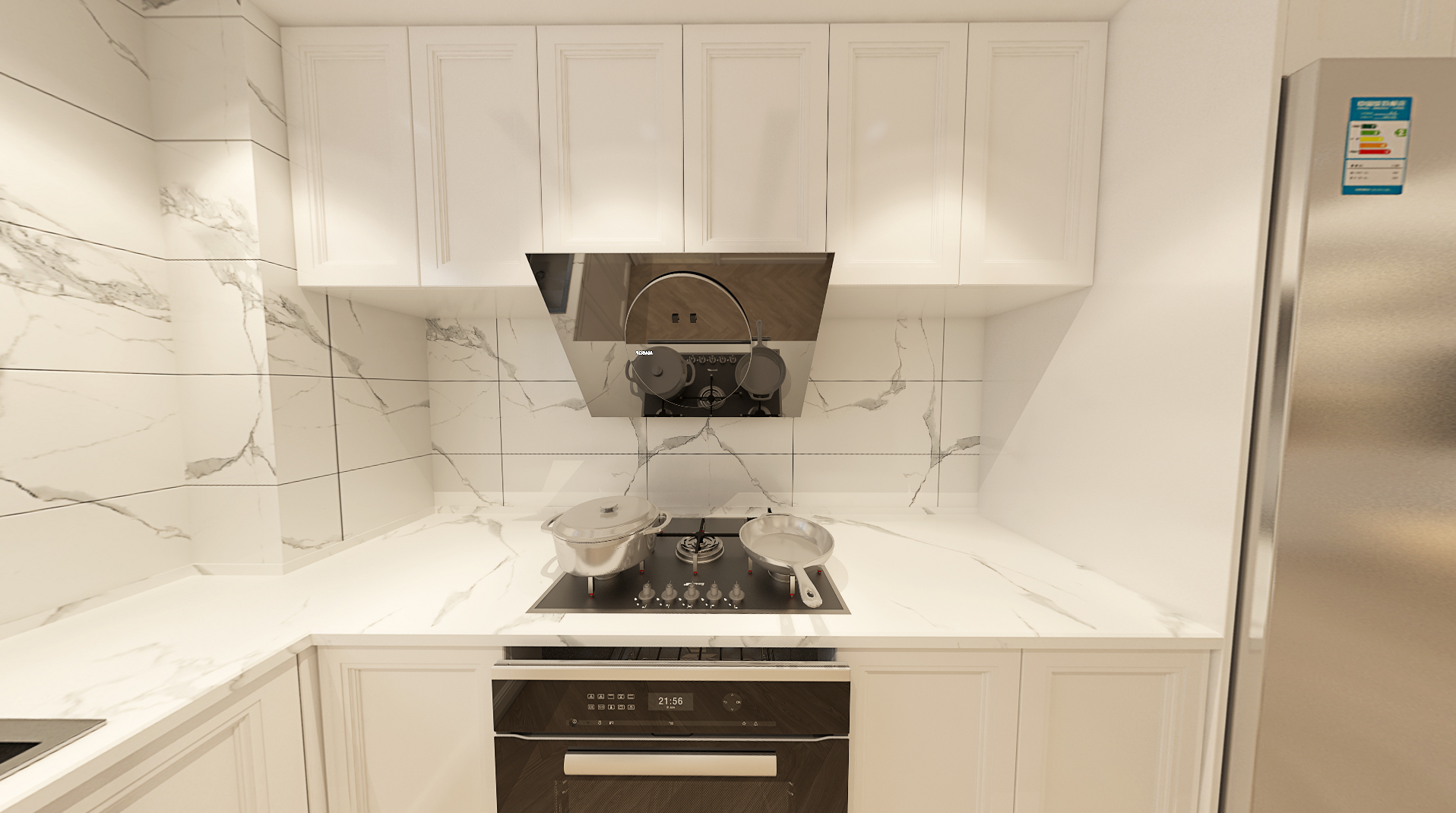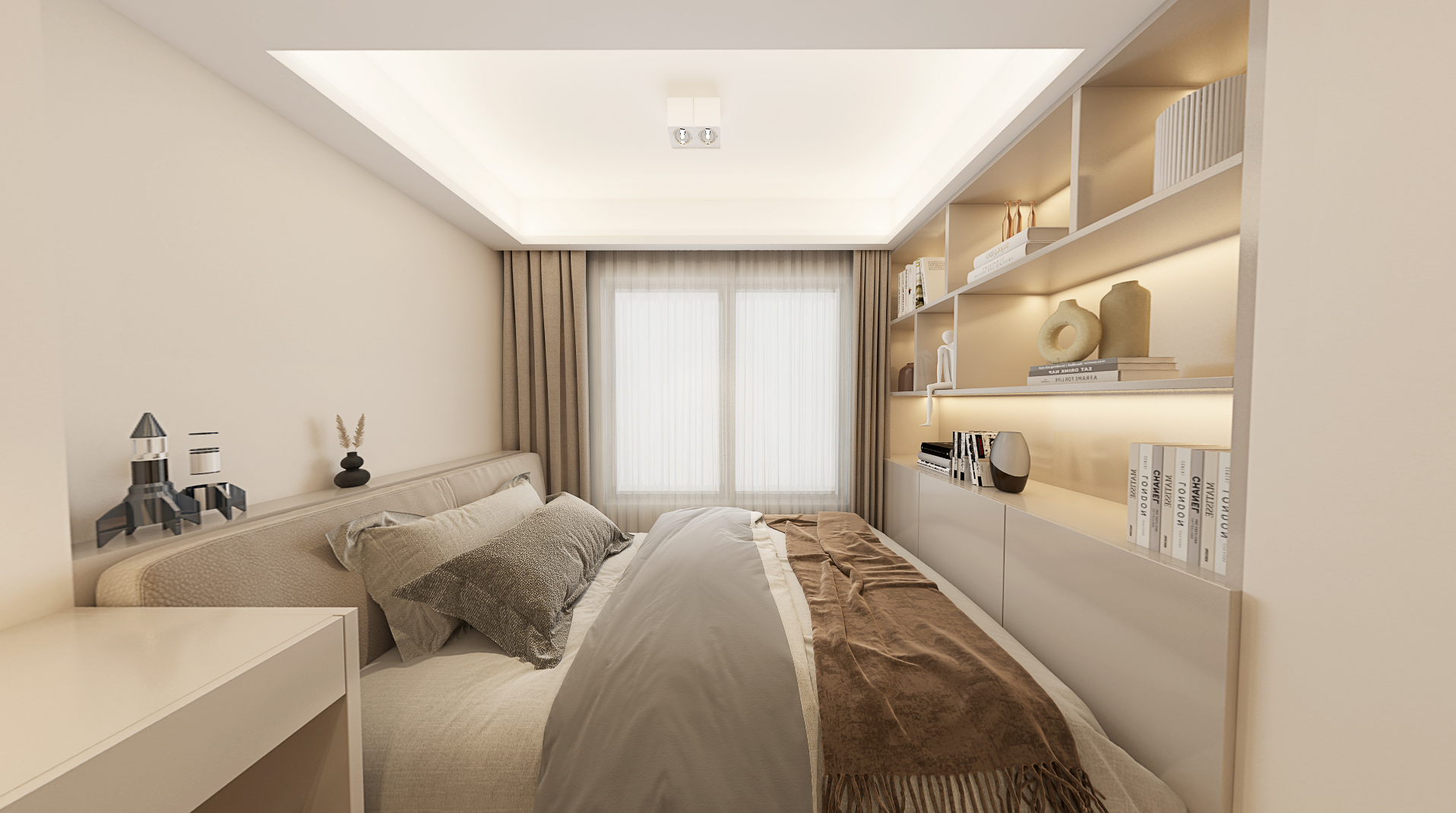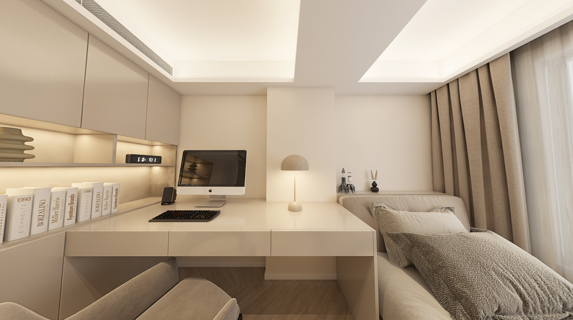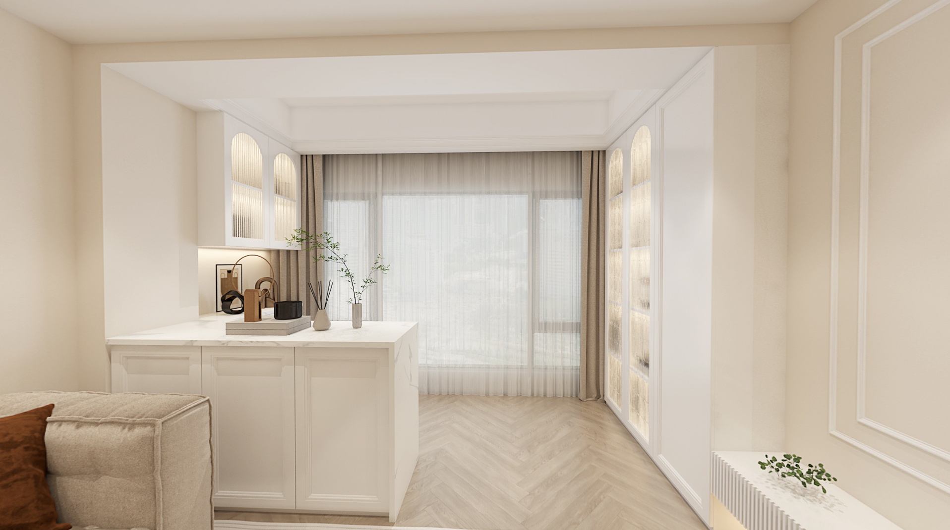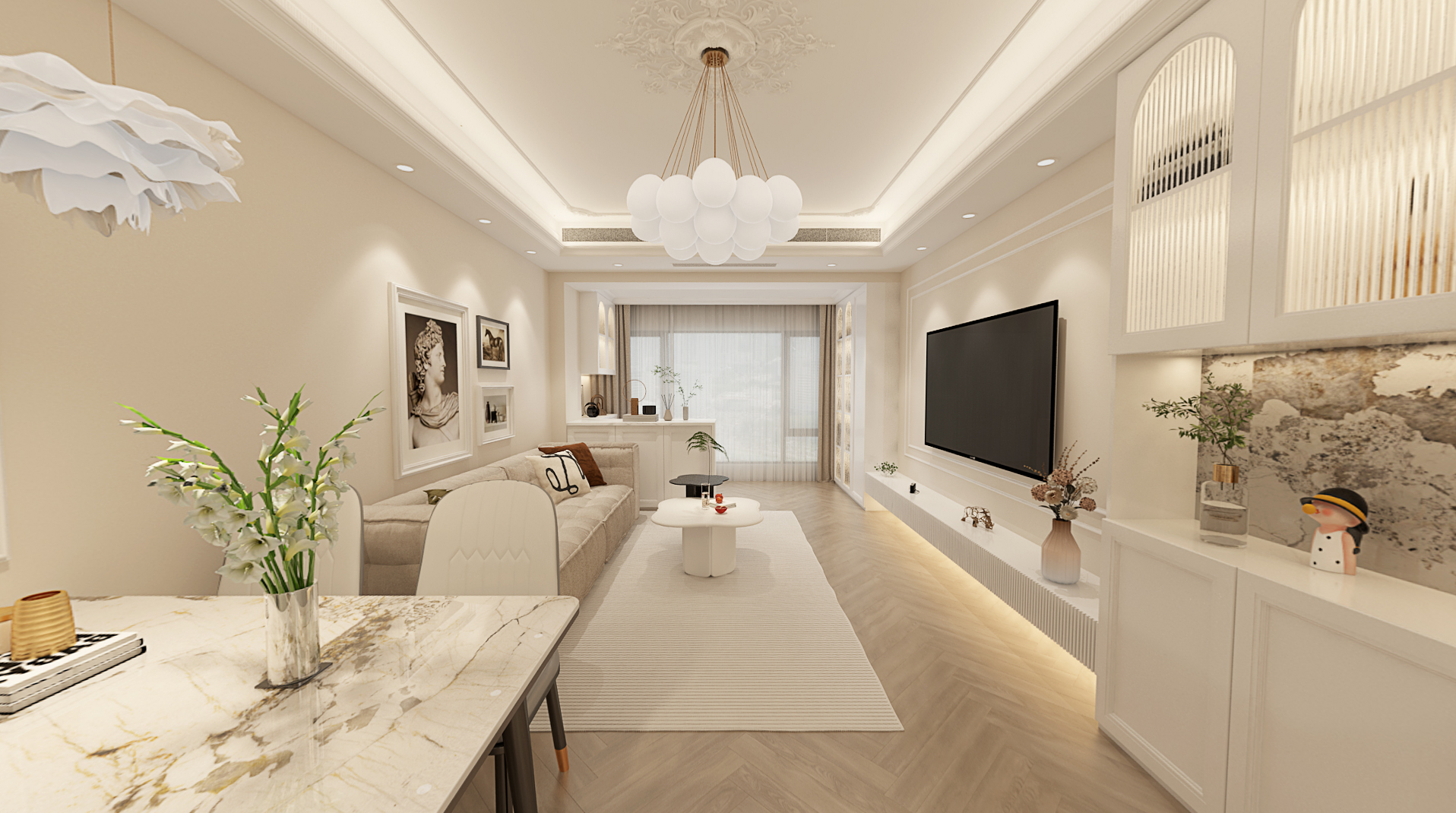 本案户型复式结构,业主需求法式风格,储物功能要多,开放式厨房。 有了明确风格,设计师更加考虑的是储储物与美观的结合,室内采用温暖柔和的灯光,地板上选用人字型暖色系铺设,与墙面暖色系涂料相响应,让置身于室内的人时刻被温馨的颜色包裹,让人身处其中就会快速放松下来。 客厅顶部的园型花盘和吊顶内的角线,空间内增添的金属线条,柜体在有限的空间内选用一些简单线条的门板,让整个空间拥有轻奢感。 儿童房与主卧则因为使用功能的不同做出了明确的风格划分,儿童房除了睡觉还需要一个舒适的作业区和玩具和书本的储物空间,在设计过程中,为了避免空间的压抑。空间也选用一些明亮灯光设计,保持光线通透。在柜体设计过程中设计开放式柜体,增加室内纵深,让空间错落有致。主卧其空间主要是睡觉,家具和空顶部园型角盘一致,使整个空间容为一体,增加睡眠体验。