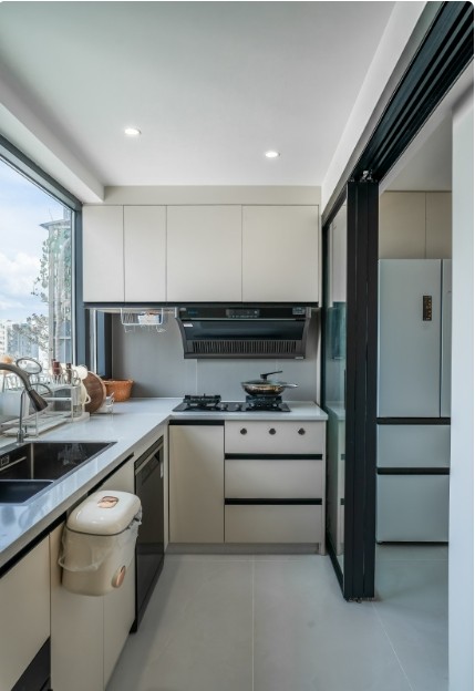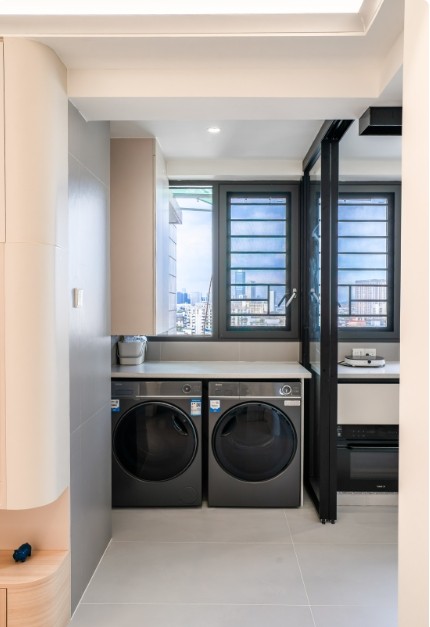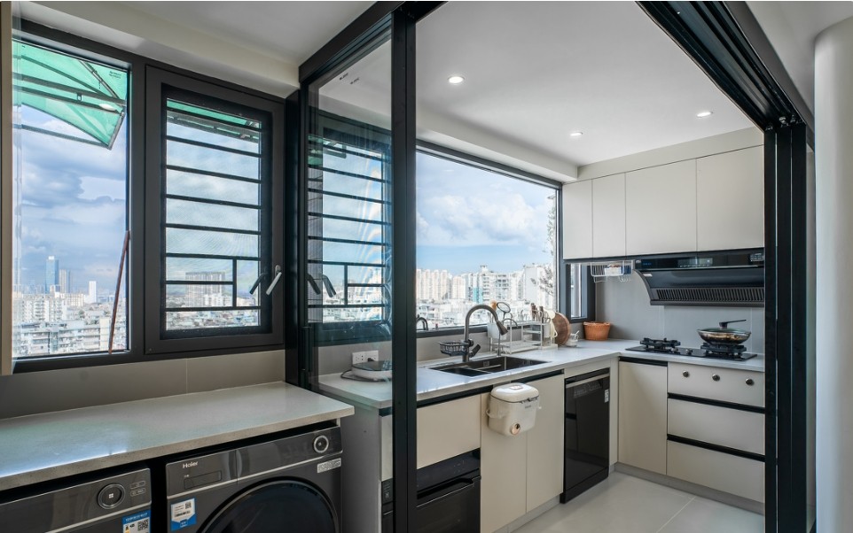 因为阳台的空间足够宽敞,设计完厨房后还可以放下洗衣机和烘干机,与厨房的排布线条简洁明了,共同揽入自然美景,充满随性慵懒的