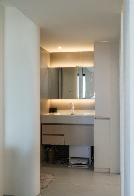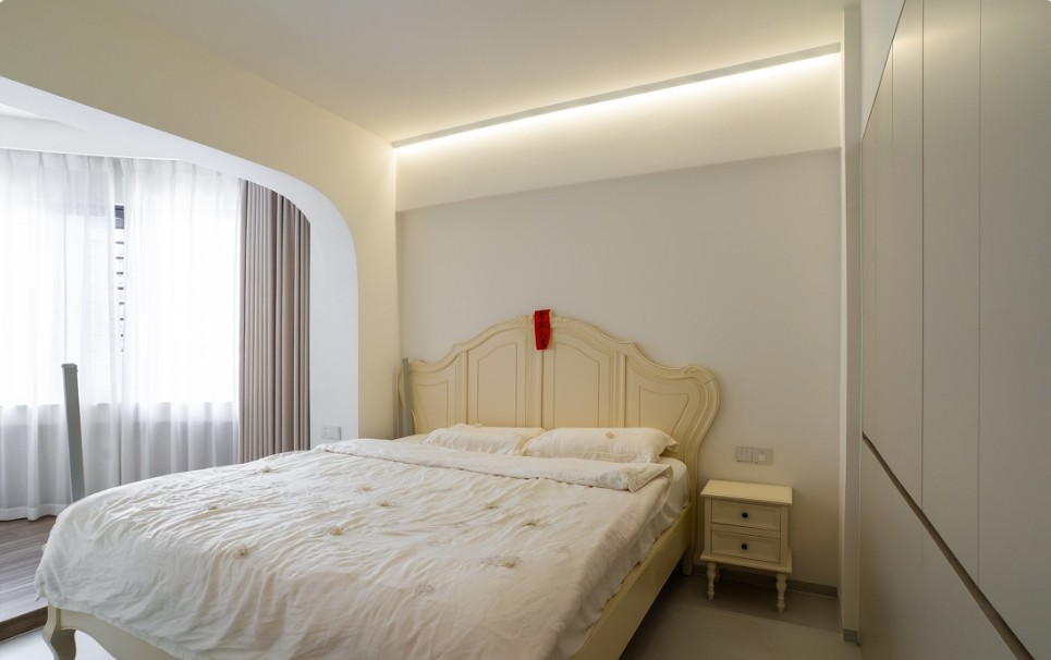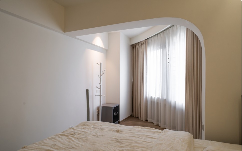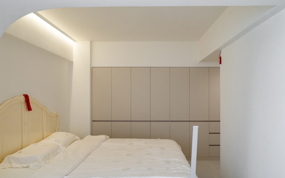 将阳台包进卧室之后,主卧拥有了更为舒适的尺度,整体的色彩搭配也是更为丰富的奶油色系,而头顶上的洗墙灯,营造了更为柔和静谧