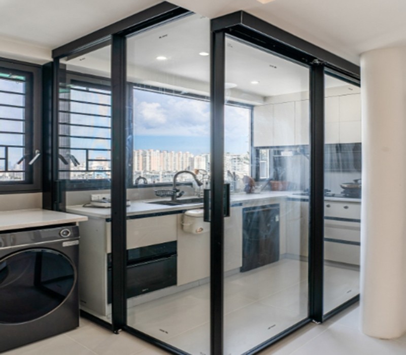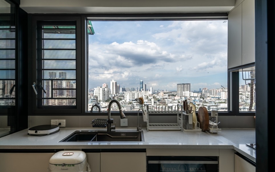 厨房改到阳台之后做了半开放设计,外有一望无际的天空,内有通透宽敞的格局,给人带来了豁然开朗的视觉享受。