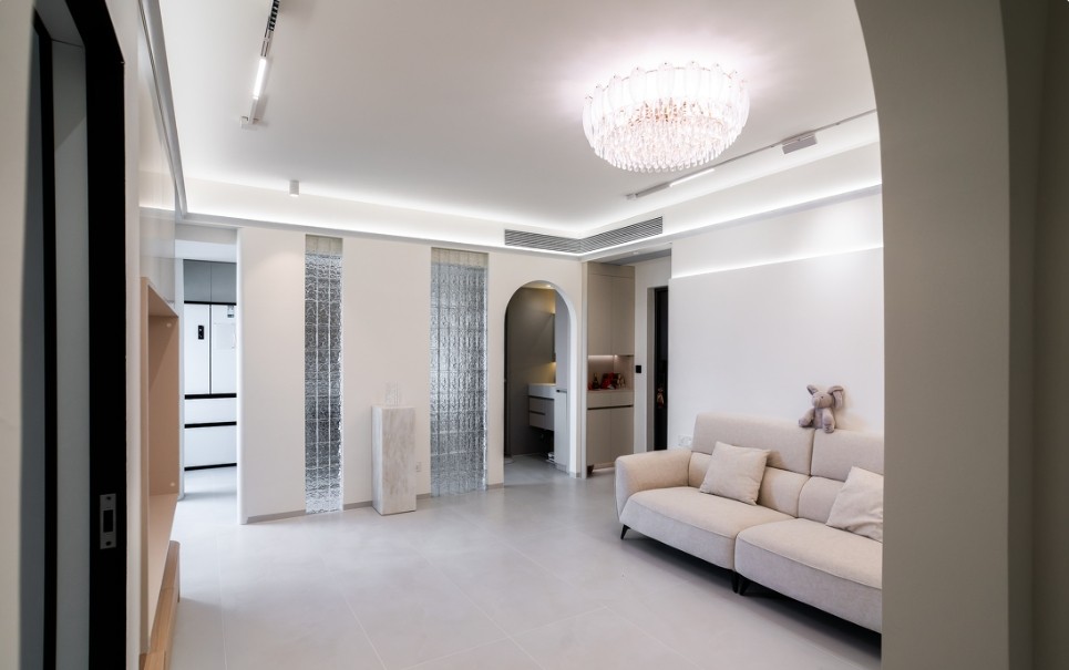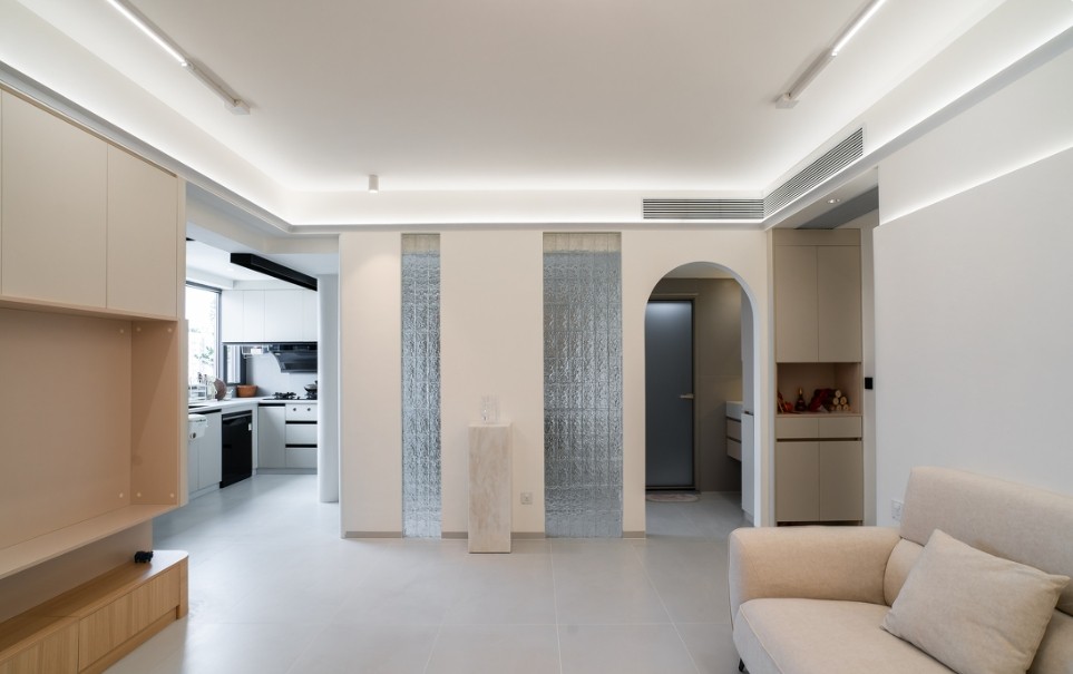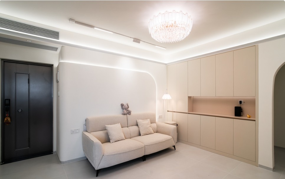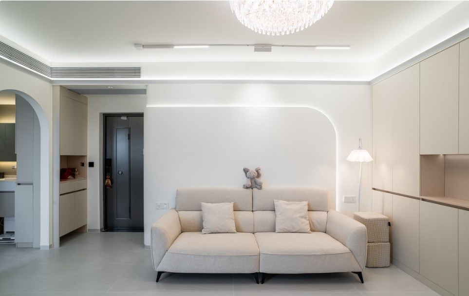 沙发背景墙做一个带弧形线条的墙板,侧边也是连接入户空间,转角处磨平了棱角,更加连贯,设计内嵌灯带,烘托出精致唯美的氛围,