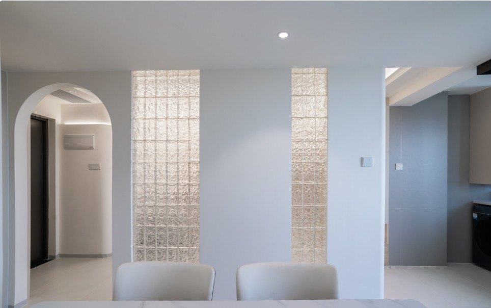 客厅与餐厅之间有一面隔断,它是墙体和玻璃砖的组合,在区分空间的同时,光源还可以互通,若隐若现的朦胧美,搭配一个岩板石柱装